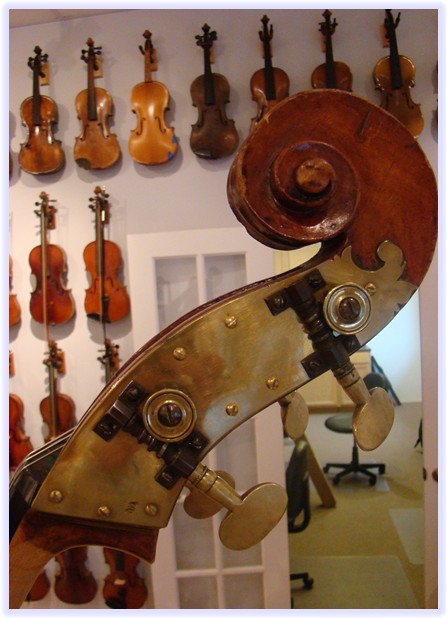 Top length,........ 45 3/4" Back to button,.. 47 1/2" Upper Bout,....... 21 1/8" Middle Bout,....... 16" Lower Bout,....... 28 1/2" Rib Depth inside the Purfling that hides the Top/Rib joint (floating Rib width): 8 1/4" at the bottom Block gently tapering to 8" at the angle break. Then tapering from 8" at the break to 7 1/8" at the Neck. String Length, 42" In reading the Article written about 5 years after the restoration, Robbie talks about the sound and how it has matured but states it's not loud bass! Currently, this bass is so loud than when I play it in my office with the other basses in the racks around it, it vibrates all of them more than almost any other bass I have with exception to the 4/4 Tarr and Panormo School basses. The bass is LOUD now, but in a sweet way as far as tone goes. The strings on the bass are Flexocor 92, put on in 1999. I am sure the bass can get even louder with different types of strings. |