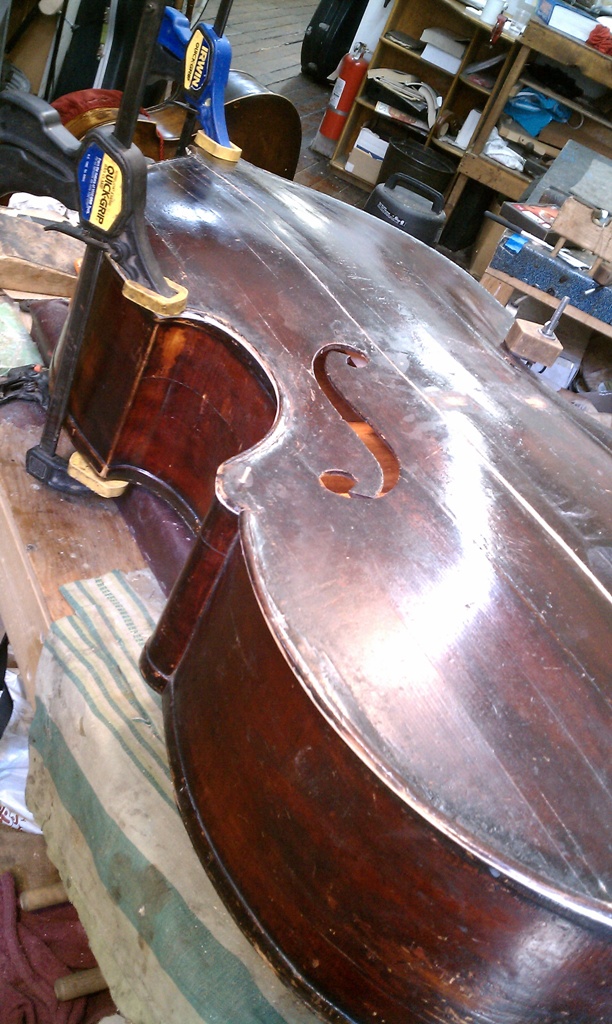 On that pic of yours above you can see from the F-hole sticking out that the Top wood is below it. That means it has sunk by the bar. Some basses just settle a bit and safe to leave as-is. It is that needed trip to a luthier like Jeff that will let you know if you are safe or not. On my bass the string length was also long and closer to an Eb neck. The only way to make it more marketable in todays world is a new neck graft shortening the playing length overall. My goal is for 42" or slightly less. Is there any way to show a pic of that torn German label inside. There are many makers named Uebel in the 18th and 19th centuries but only one listed as W.Uebel in the last quarter of the 19th century, not listed as Wilhelm though. He (W.Uebel) was from Markneukirchen Germany which was later East Germany on the German/Czech border. I suspected my bass to be from that area rather than further south in Mittenwald mainly because of the roundback. Most old Mittenwalders are Flat backs. There is some slight possibility that his shop made these basses of ours but also a 50/50 chance at this point he either repaired it or the lable doesn't belong to the bass. The dates of the late 19th and early 20th centuries pre-WWI fits W.Uebel's period as does the area in which he worked. Another larger Orchestra model Bass was sold not once but twice as a 1850-60's French Parisian Bass by another big shop in NY in the last couple of decades as well. I had a chance to examine that bass and could see just as with our basses how a dealer could 'loosely' call it French but in reality, the work is totally German. Style of design does not make it the nationality of its looks. It has to fit the work. When you see a bass like that regardless of size or design with outer linings and it is marked as French, be on the alert that this is probably 10 out of 9 times false. ;) Many fine basses were made in Germany that were not Shop or Factory basses but rather hand made instruments just like a fine French, Italain or English bass only it's German. Many of the nicer German basses are called something other than German, possibly for profit reasons but also due to mistake in identity. The countless factory basses imported to USA in the last century has clouded our judgment as to what a better quality German bass might be. One more related story if I may. I was at the first rehearsal (of 3 or 4) for a Mahler 1 concert in which the orchestra was enlarged for this production and 3 new basses were hired in as subs. The guy on the end (I placed him there..lol) had a dark varnished sloped shouldered bass like ours but with a flatback. It had 100 year old Mittenwald gears on the bass like those I have seen on Neuner & Hornsteiner basses, the exact ones and the purfling ran all around the top and back as well like on French basses and our twins as well. So, to poke around I asked him on the break "hey, do you happen to know what pedigree your bass is?" asking him in a respectful manner as he was a total stranger to me. I was willing to bet my house that he bought it as a French bass. He replied "It's a Lupo!".. :eek::eek:.. Lol.. Ok, now he was not only lied to at the time of sale but his bass was placed up there name wise with the likes of Panormo and Strad. Lupo was the French Strad and was a violin maker for the most part if not exclusively. There is no such thing as a Lupo bass that I know of and Lupo predates his bass by about a century. Also, that style of Bass is mainly closer to the 20th century, however I have seen a couple of claims that some of them were Vuillaume basses that were actually French but sloped shouldered. So, it seems almost a common practice that any nicer made German bass that looks French in design becomes one once it passes thru a dealers hands when it goes to market. Please, don't sell me a Chevy Impala as a Lincoln Town Car. It just isn't, plain and simple, not even close. In closing, my friend that was sold a Parisian French Bass that was 30-40 years later made in Germany was looking a bit disappointed shortly after hearing my assessment. I then went on to add, "be thankful that it IS a German bass. It sounds better than most of the French I have heard." On average a similar model French bass and a German made example of the same outline, the French for some reason sell for more. First off, it takes the idea of 'factory' out of the buyers mind if it's not German as that's what most of us know about German basses here and second, it implies it's higher up the pedigree chain. This is also totally false. I have used several Italian and English basses in Orchestra but I have also proudly played on a few German Basses on the job as well. Currently I am gearing up to use my Mittenwald Bass for part of the season after getting it back from Jeff Bollbach with a beautiful C-Extension on it. It can sit beside my better basses and do just as well on the job. I can just as easily call my Mittenwald bass English or Italian as I have seen similarities in both. It is just what it is and I am proud to label it as such. |