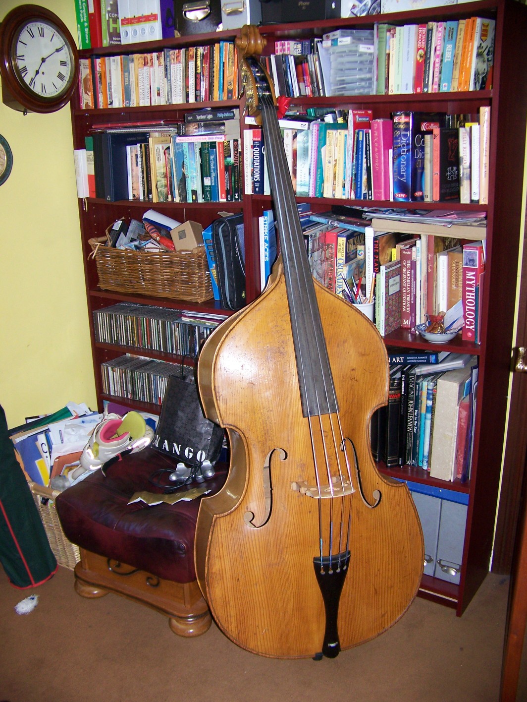 Basses like this even being lower end carved models go for at least $2-3k at a minimum here. My first carved Bass was similar but about 50-75 years old in 1970. Take good care of it and keep it well adjusted. Never alter the Varnish on a carved bass. In repair, touch-up and maybe french polishing or clear-coating at the most after repairs. This is only to be done by a qualified Luthier. Other woodworking professionals and hobbyists are just not schooled in the materials used in varnishing, making or repairing violin family instruments. This Bass looks fairly healthy so just make sure it doesn't get banged around too much. Basses can crack easily especially if dropped. A repair can easily cost in the thousands depending on the damage done. I just had one restored that ran well over $20k, but under 30. I will pick it up in a few hours and see the total cost. It was brought in 5 years ago and I've never played a single not on the Bass. Actually, to the credit of your countrymen, it's an early English Bass from 18th century London. I still own 4 of the 5 English Basses that I have bought. All but one of them are from the King George era (Geo. III and IV I believe). One is a modern replica of a J.F.Lott c.1830 or so. In case you were not aware, England back in the day produced some of the finest Basses in the world ranking with some of the better Italians. Make your daughter aware of the care a Bass needs and to be carefully not only carrying it around but other players walking near here with their instrument cases. A Bass is like a big delicate baby. It cannot take care of itself. It always needs mothering. A few months ago a trombone player on the way out of rehearsal bumped his case into me highly valuable attributed Storioni while it was in the bag on the floor while I was gathering up my music from the stand (I always pack the Bass first for safety). Last month we played a concert together with a reduced chamber sized orchestra and he was at my side all week. I reminded him of the incident which he was clueless about but I did let him know that the Bass he bumped into (it was in its padded bag) was about the price of a house. He now knows to be careful and not walk near the Basses with his case. I guess he needs his house.. lol I learned about caring for a Bass in the 8th grade. Me second teacher then was a former professional bassist as well and taught us about caring for an instrument and respecting it. Teach her this now. She will have it for life. |