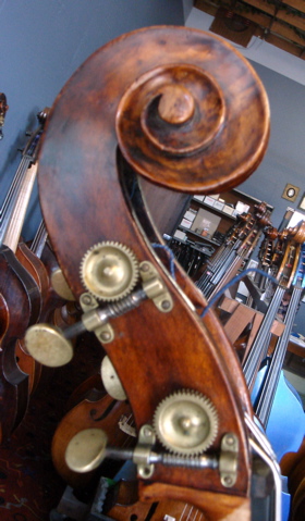 I have owned 4 English Basses thus far with 3 of them still in my possession. I have also owned 4 Italian Basses in the past (two now) and I must say that my 4 English Basses match or surpass my 4 Italians. I have a Bass that I acquired in 2005 and sold in 2006 that I wanted to ID. How many people here have seen English Basses Circa 1800 with 3-piece tops. The center piece is about 10" wide. The lower bout is 27.25" across. This is the first old English Bass I have seen with a 3-piece top. The ff holes are not centered evenly at all from the neck. One is 3/6" lower than the other. The nicks are sharp 'Diamond' like cuts that are NOT off-set but rather even across facing each other. The Scroll is another Great work of art like the Gilkes but completely different. Oh, and the Varnish is a beautiful Golden Brown Oil typical of Dodd and other English makers of that period. This is the Bass here; http://www.kensmithbasses.com/Double...d/DoddBass.htm On a British Appraisal of the Dodd, it is mentions that it was used in the London Symphony (LSO), Royal Philarmonic (RPO) and the BBC Orchestra. The London Orchestras are known for their formidable sounding Bass section. My Dodd it the deepest most powerful Bass I have ever heard or played. Can you imagine a complete section of basses like this? That could be scary! These are the other English Basses I have currently; http://www.kensmithbasses.com/Double...GilkesBass.htm http://www.kensmithbasses.com/Double.../Hart/Hart.htm http://www.kensmithbasses.com/doublebasses/MysteryBass/name_that_bass2.htm |