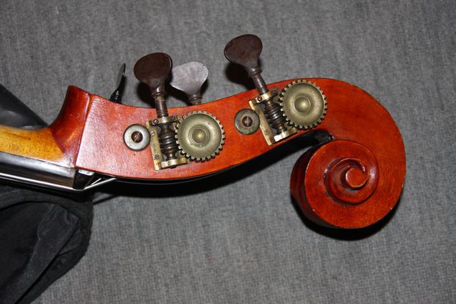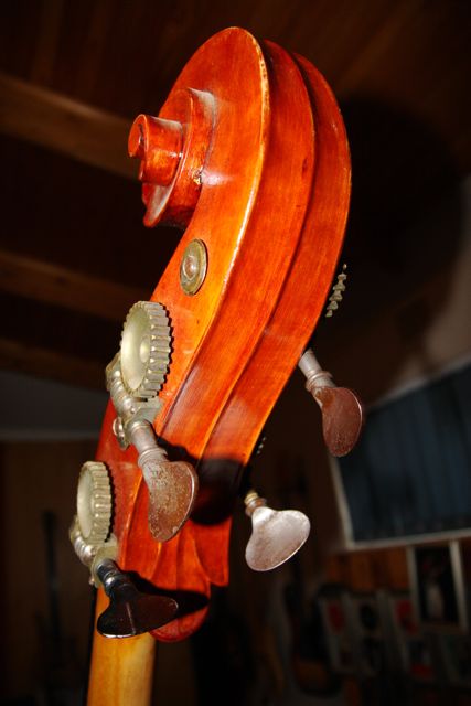 1) It looks like it has been re-varnished at some stage 2) the gears are original to the scroll / there is not a hint of any other covered up holes marks etc ! 3) The neck does have a darker varnish than on the body / I am 100% sure that the bass has been repaired along the way ... I noted that the tuners are of a similar type to a Tyrollean bass I saw on the site ? |