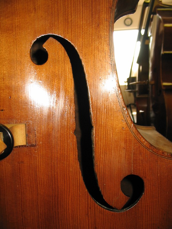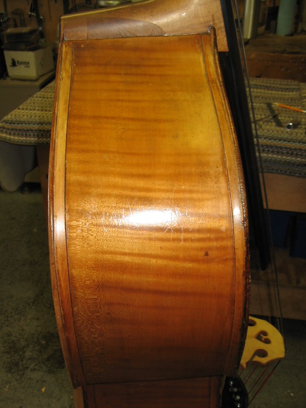 The guy who previously owned this bass did some work on it himself and I think he was in the process of refinishing. It now has just a clear coat of varnish. The varnish on the scroll was once a nice red/brown color.