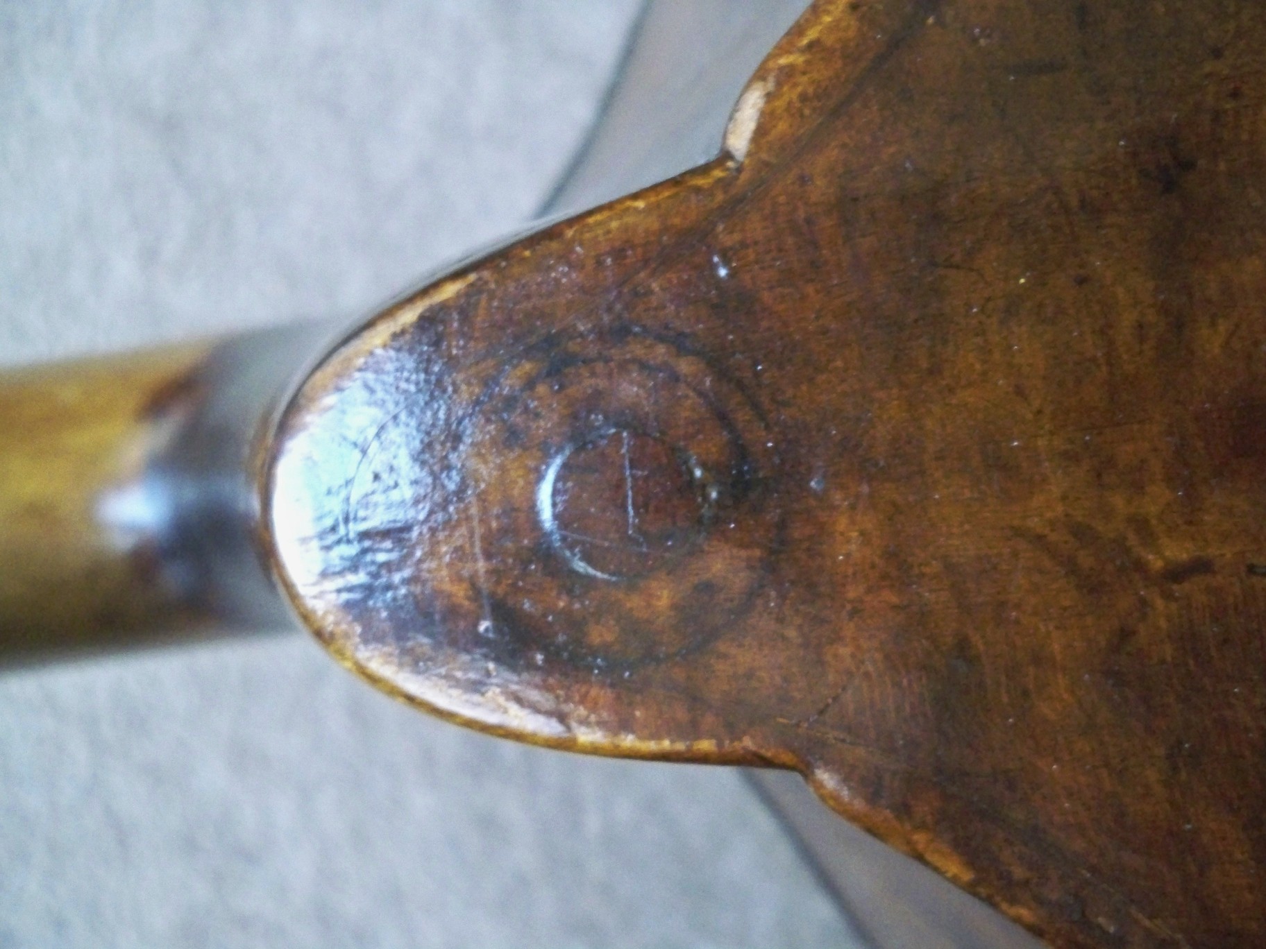 Thanks for your interest,I tried my best with a magnifying glass and took a few more pics in different lights (tried even different filters in Aperture),but I cannot really find any letters...at 2 o'clock there almost is some writing..other questionmarks,are the tuning keys original,there seems to be old holes that have been filled..