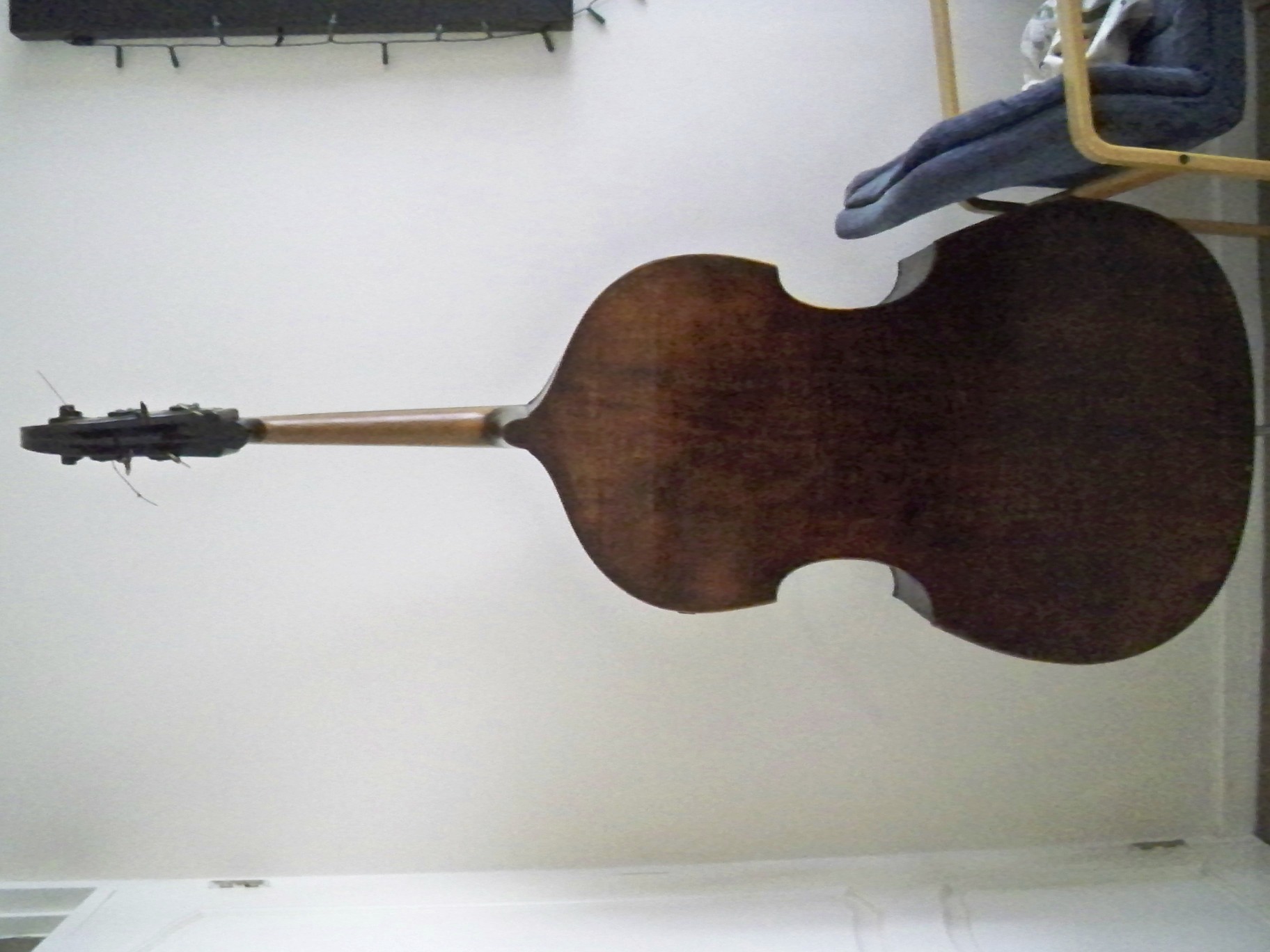 There is a washed out seal or stamp in the back button. I have seen basses like this. If you can make out some of it, maybe I can ID the name.