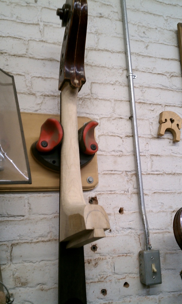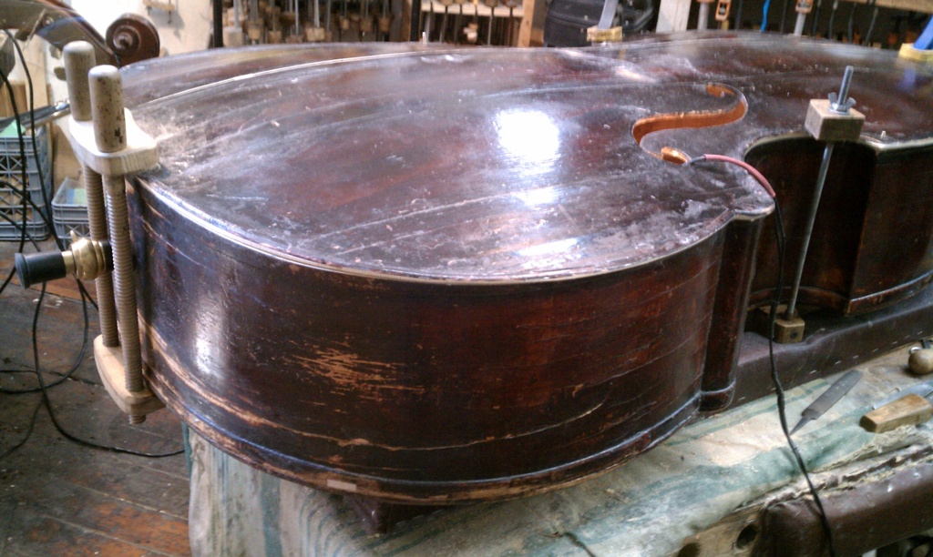 On that pic of yours above you can see from the F-hole sticking out that the Top wood is below it. That means it has sunk by the bar. Some basses just settle a bit and safe to leave as-is. It is that needed trip to a luthier like Jeff that will let you know if you are safe or not. On my bass the string length was also long and closer to an Eb neck. The only way to make it more marketable in todays world is a new neck graft shortening the playing length overall. My goal is for 42" or slightly less. Is there any way to show a pic of that torn German label inside. There are many makers named Uebel in the 18th and 19th centuries but only one listed as W.Uebel in the last quarter of the 19th century, not listed as Wilhelm though. He (W.Uebel) was from Markneukirchen Germany which was later East Germany on the German/Czech border. I suspected my bass to be from that area rather than further south in Mittenwald mainly because of the roundback. Most old Mittenwalders are Flat backs. There is some slight possibility that his shop made these basses of ours but also a 50/50 chance at this point he either repaired it or the lable doesn't belong to the bass. The dates of the late 19th and early 20th centuries pre-WWI fits W.Uebel's period as does the area in which he worked. Another larger Orchestra model Bass was sold not once but twice as a 1850-60's French Parisian Bass by another big shop in NY in the last couple of decades as well. I had a chance to examine that bass and could see just as with our basses how a dealer could 'loosely' call it French but in reality, the work is totally German. Style of design does not make it the nationality of its looks. It has to fit the work. When you see a bass like that regardless of size or design with outer linings and it is marked as French, be on the alert that this is probably 10 out of 9 times false. ![]() Many fine basses were made in Germany that were not Shop or Factory basses but rather hand made instruments just like a fine French, Italain or English bass only it's German. Many of the nicer German basses are called something other than German, possibly for profit reasons but also due to mistake in identity. The countless factory basses imported to USA in the last century has clouded our judgment as to what a better quality German bass might be. One more related story if I may. I was at the first rehearsal (of 3 or 4) for a Mahler 1 concert in which the orchestra was enlarged for this production and 3 new basses were hired in as subs. The guy on the end (I placed him there..lol) had a dark varnished sloped shouldered bass like ours but with a flatback. It had 100 year old Mittenwald gears on the bass like those I have seen on Neuner & Hornsteiner basses, the exact ones and the purfling ran all around the top and back as well like on French basses and our twins as well. So, to poke around I asked him on the break "hey, do you happen to know what pedigree your bass is?" asking him in a respectful manner as he was a total stranger to me. I was willing to bet my house that he bought it as a French bass. He replied "It's a Lupo!".. ![]() .. Lol.. Ok, now he was not only lied to at the time of sale but his bass was placed up there name wise with the likes of Panormo and Strad. Lupo was the French Strad and was a violin maker for the most part if not exclusively. There is no such thing as a Lupo bass that I know of and Lupo predates his bass by about a century. Also, that style of Bass is mainly closer to the 20th century, however I have seen a couple of claims that some of them were Vuillaume basses that were actually French but sloped shouldered.So, it seems almost a common practice that any nicer made German bass that looks French in design becomes one once it passes thru a dealers hands when it goes to market. Please, don't sell me a Chevy Impala as a Lincoln Town Car. It just isn't, plain and simple, not even close. In closing, my friend that was sold a Parisian French Bass that was 30-40 years later made in Germany was looking a bit disappointed shortly after hearing my assessment. I then went on to add, "be thankful that it IS a German bass. It sounds better than most of the French I have heard." On average a similar model French bass and a German made example of the same outline, the French for some reason sell for more. First off, it takes the idea of 'factory' out of the buyers mind if it's not German as that's what most of us know about German basses here and second, it implies it's higher up the pedigree chain. This is also totally false. I have used several Italian and English basses in Orchestra but I have also proudly played on a few German Basses on the job as well. Currently I am gearing up to use my Mittenwald Bass for part of the season after getting it back from Jeff Bollbach with a beautiful C-Extension on it. It can sit beside my better basses and do just as well on the job. I can just as easily call my Mittenwald bass English or Italian as I have seen similarities in both. It is just what it is and I am proud to label it as such. |