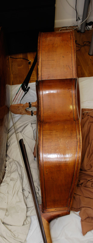 On my bass, in writing under the Tailpiece (on it) says, "V. Venegas, Uebel". The repair work is beyond my dreams. Beautiful work and the former LONG 3/4 is now proportionate to it's size at about 41.5" length. The new neck, block cut and deeper neck set allowed this. Plus, a huge discovery I missed. This is the ex-Victor Venegas bass! Mike MaGee that did the work on it worked at Kolstein's a long time ago and remembers this exact bass coming in with Victor several times over the years. Mike told me that when a bass came if for a restoration Barrie would write under the TP who's bass it was and in this case, what bass it was as well. Maybe because Victor owned several basses I assume. Also, personally this means a lot to me. Victor was a good friend of mine and a mentor. We even did set-up work together on basses of his students and friends. He would being them to my house, assist me with the work (I did most of the important stuff, lol) and deliver the bass back and collect the money. He also straightened me out with my Bow hold per-John Schaefer (NY Phil) and got me to go back and study again which changed my life. Schaefer would not take any more students at that time so I studied with his top student Bill Blossom, now in the NY Phil. for about 35 years or so. So, this bass being Victor's old gigging bass means a lot to me. I know he had two others but this looks like it was his work horse for a period of time. |