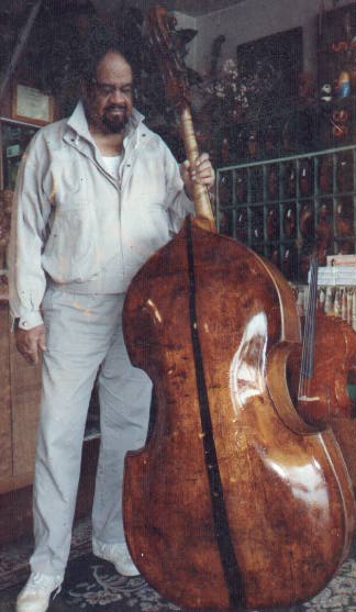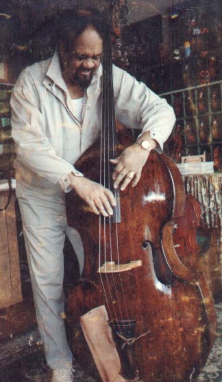 I just found some pics of him and his bass on line so I thought I would share. Also, one night after the show, I had brought in my camera and took some pictures of the two basses, some of his bass and some of him with his bass in hand as well as holding both basses side by side. I can't share them now as I don't have a working scanner but maybe some day. One thing I noticed and now looking back at what I have learned of old basses was this. Round backs were rare on basses from that region then, especially in Austria and we rarely see any German bass before 1800 without a flat back as well. His bass also has outside linings but they are flush with the top and back. That to me is a cross between Bohemia and Germany, hence Markneukirchen (