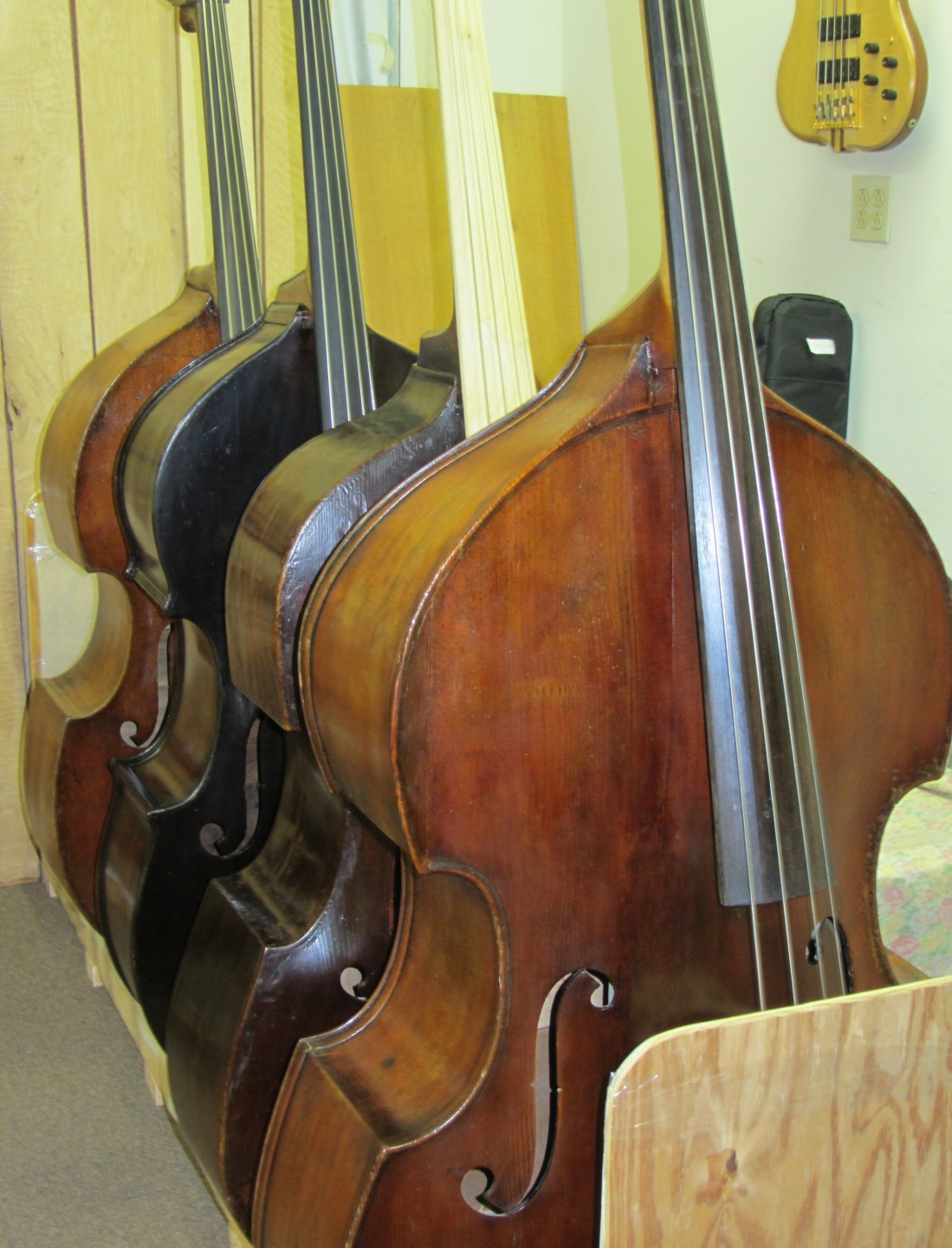 They are from front to back; a German Flatback Orchestra Bass by Hermann Dölling c.1900, a Viennese Bass/Violone by Ferdinand Hell, Vienna c.1830, a Bass by Mihaly Remenyi, Budapest c.1900 modified with Violin corners and outer linings in the olde English Style, and a 3/4 Prague/Bohemian Gamba c.1850 (attributed to Jan Bina). |