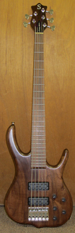 Pictured here is a 5M-P model in 2-piece matched Black Walnut. This model will look the same from the outside but have the 9v Circuit inside. The other two models will have either Maple/ Walnut wings or Walnut/Maple with center block & Maple or Walnut Top and Back with Mahogany core and center block as well.