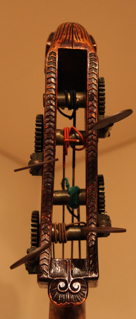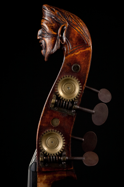 Notice the angled Flat Back. That is not a French trait from what I have seen! The head varnish and the back varnish are completely different. The open peg box is also weak like that. Maybe, Bernardel did the head for him. Looking at that head, could it have been craved out of a regular scroll? Or is this a replaced neck graft with scroll grafted on for that bass with the head carved?