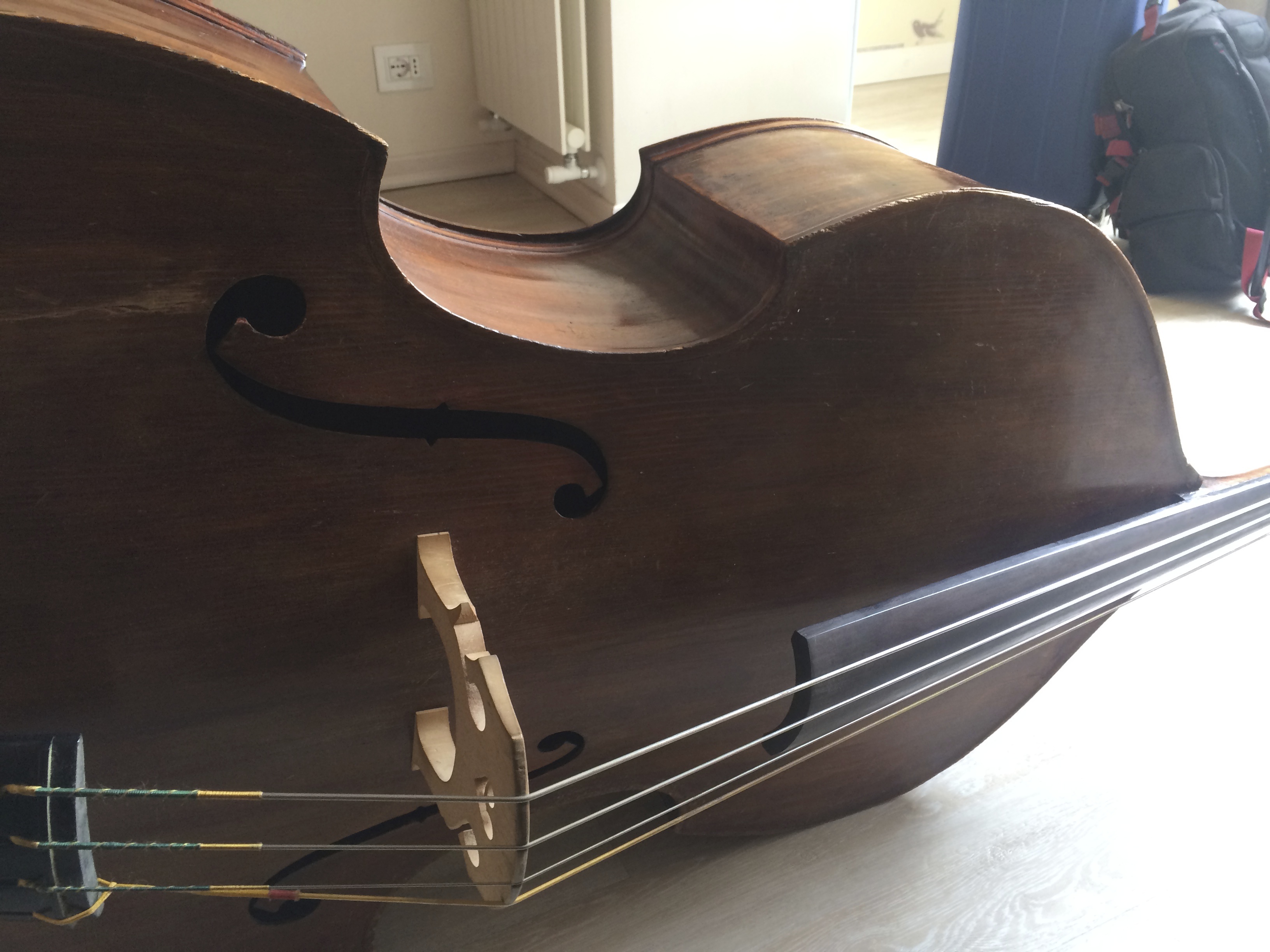 Scroll Repaired, back repair where the neck broke out from it before, bad over varnishing, etc.. Value for a bass that no one wants to play? I don't want the bass at any price. Fixing it and making it 42" scale will cost more than the bass is worth many times over. It is just too big. 3-string basses were made into the 20th century. That means nothing. The health of the bass means a lot and the size. If too big to play comfortably, I don't see it being worth any investment at all.