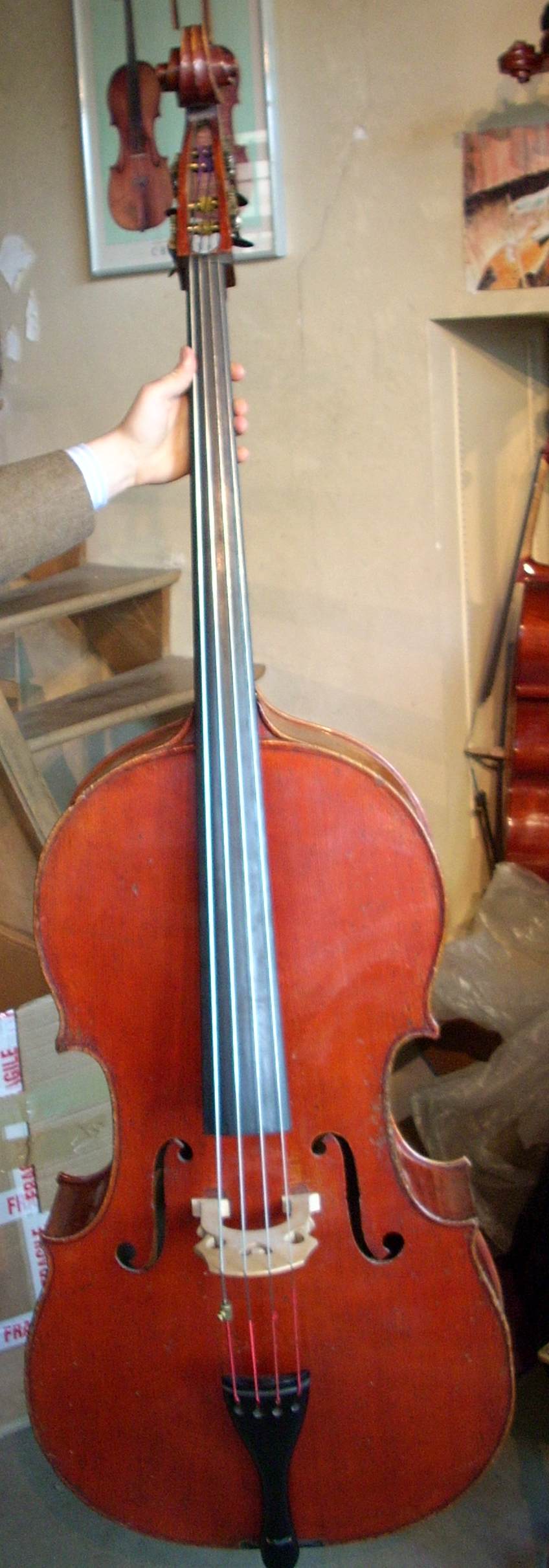 That is one peculiar looking bass, particularly around the neck region. Kinda looks like a regular bass with a "cello" style top stuck onto it. Is all that carving (double button etc) all part of the design, or is it a result of a reconstruction somehow? From the side, the neck heel looks rather weird ... how to be sure where your D stop is with such a wide heel curvature! looking again at those machines, they can't be original? sure looks to me like the whole pegbox has been reworked in an "individual" way. mt |