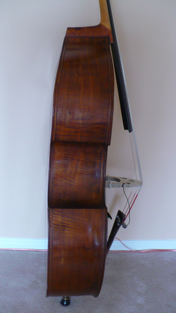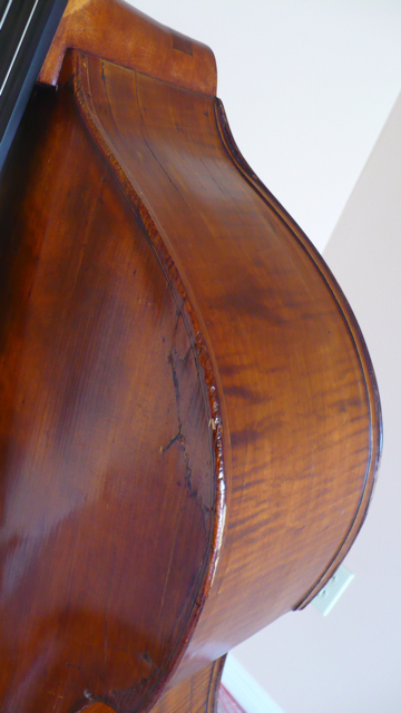 The back does not appear to be original to me. I have not often seen tightly flamed maple like this in a double bass. The color is slightly different than the sides(which also have a nice figure to them).