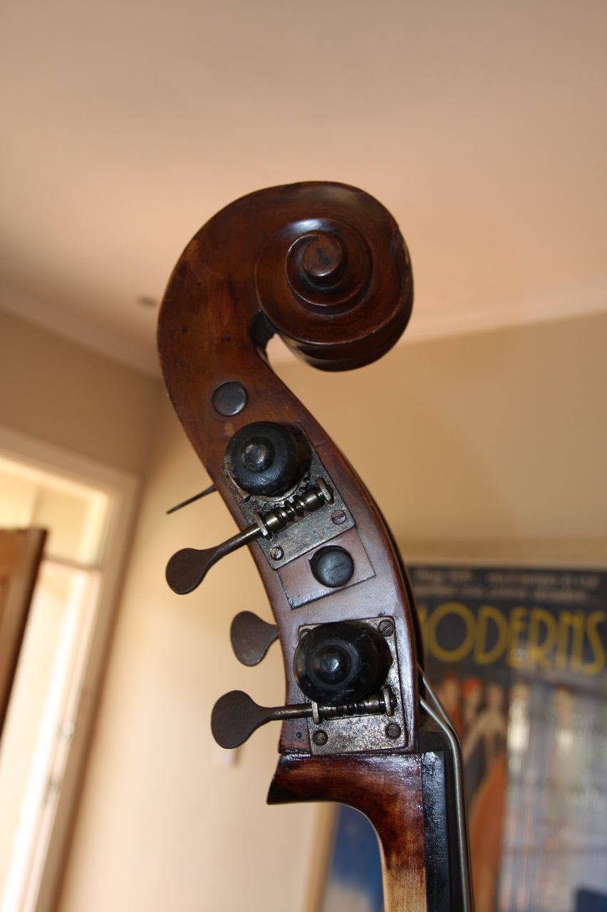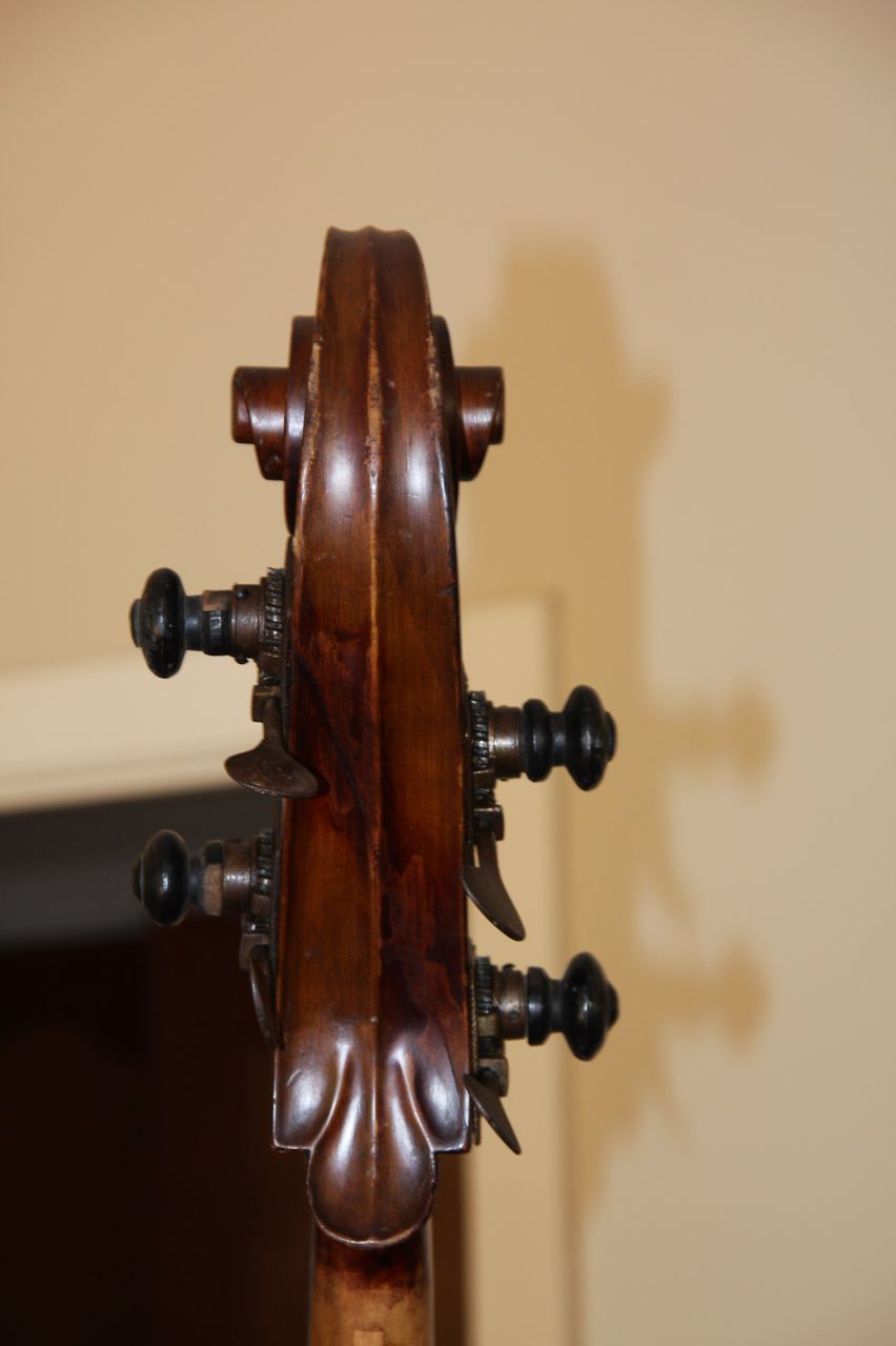 Re-varnished poorly as well as the Scroll in a darker color does hurt the value quite a bit. The Scroll although French as well is no guarantee it belongs to THAT bass. The Scrolls were usually 'Guild' made anyway and were supplied to more then one shop from the same supply but having it all original is a plus. That center wide crossbar is original but the upper and lower bars were maybe added later. The French did not usually mix those two designs that I have seen. |
