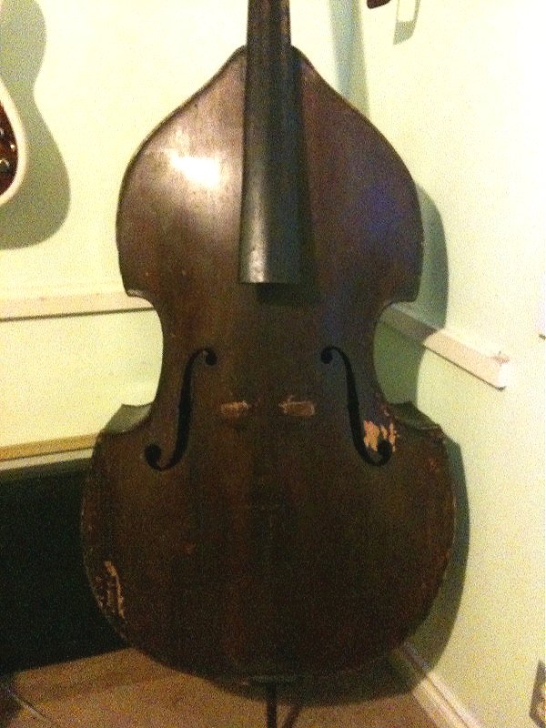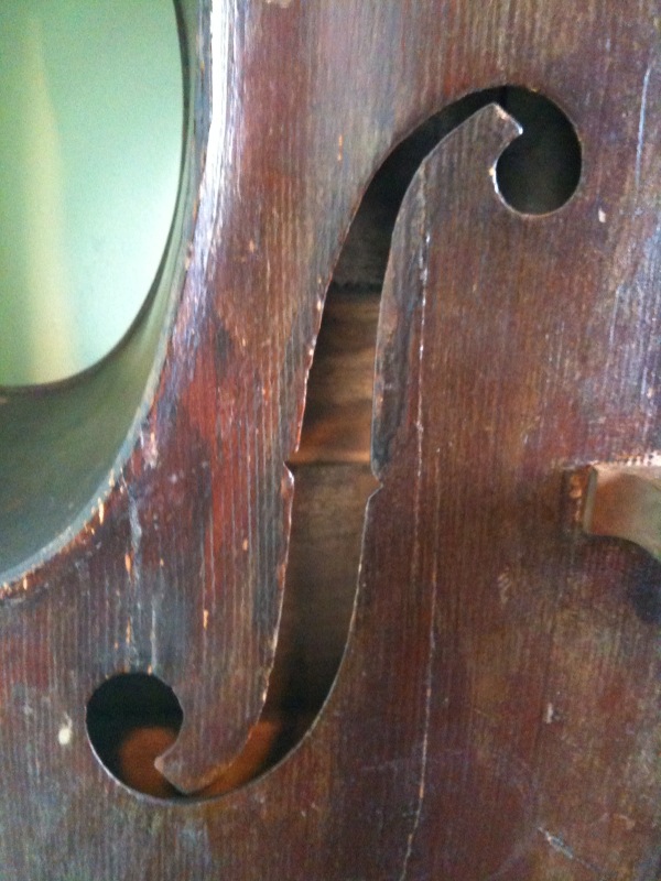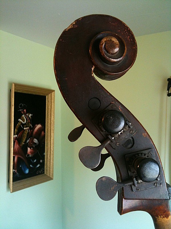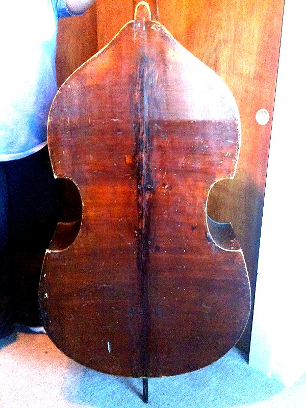Yes the bass is small but it has a very nice shape and the top has a much larger bulge than my larger German shop. The wood is also quite thin, back 1/8", top is .25" at the edges. It has thin purfling on the top and back. From the outside the sides appear to have flame but I can't be 100% sure i'm seeing the flame on the inside of the ribs. Body length-40.5" Top bout-18.75" Bottom Bout-24" Depth-7.75" In any case I didn't spend too much, $700 including the bridge and a ancient bow which has had a really odd repair and pretty much unusable. The shape and size is very nice, cosmeticaly not so much. The fingerboard paint (yes it was painted) is flaking off as well as some of the finish. There are a few cracks here and there but nothing open or terrinble looking to my untrained eye. Anyway being a jazz player (of sorts) I would really like to get this bass playing again and I know it will not be an inexpensive task. |