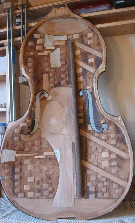 My old French bass is currently undergoing a fairly significant restoration of the top. I’ll attach a ‘before’ photo. It has been re-arched in a cast, and a large number of old cracks, cleats, patches and straps are being removed and redone, including chest and soundpost. The bass bar, which had been sprung too hard and was actually cracking the top from the inside, will be replaced (and not sprung). There was a lot of woodworm damage, around the lower end of the center seam and bass bar particularly, which had been “repaired” using epoxy . This is being removed and new wood patches inserted. The restoration is being done by Tom Barrett and I feel that he is doing an excellent job.