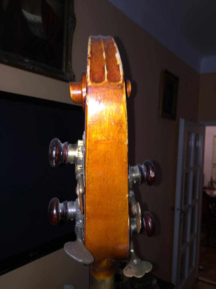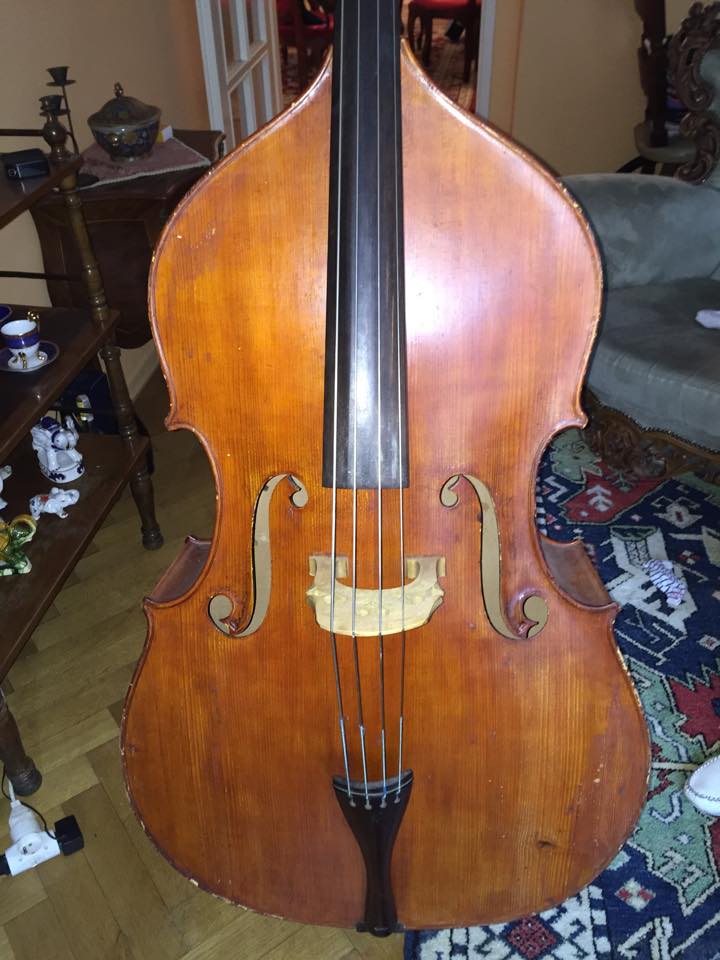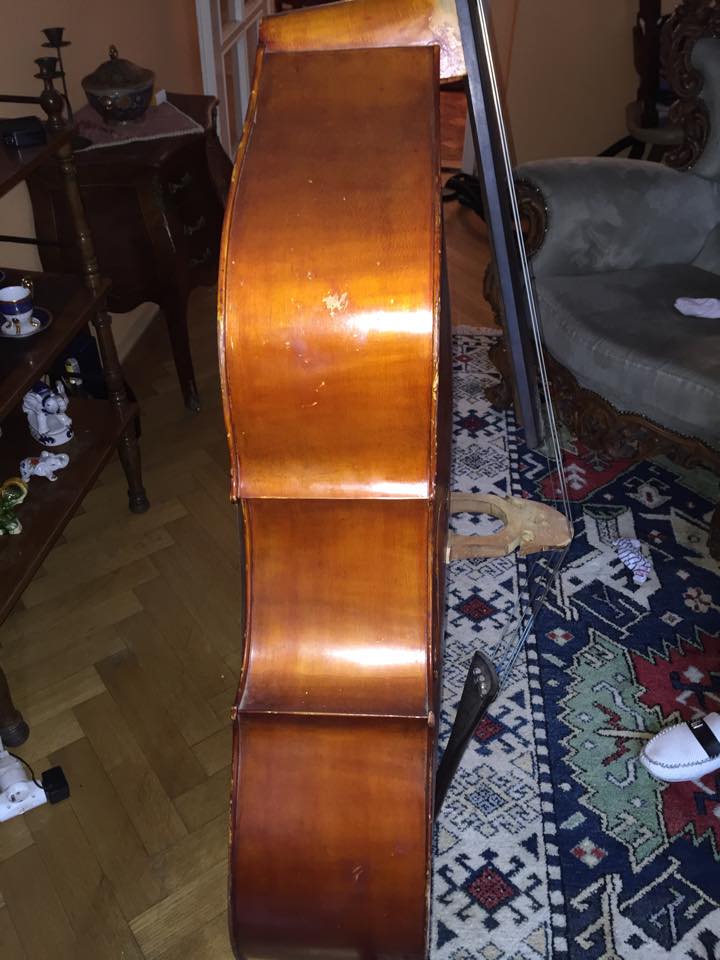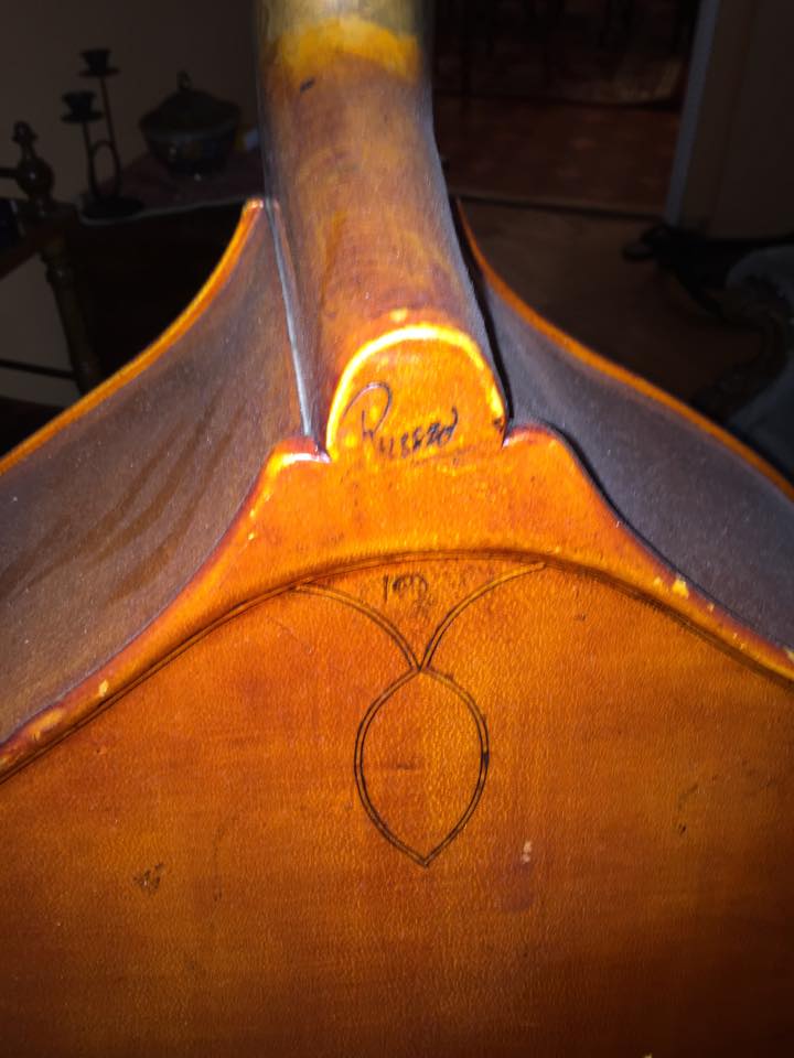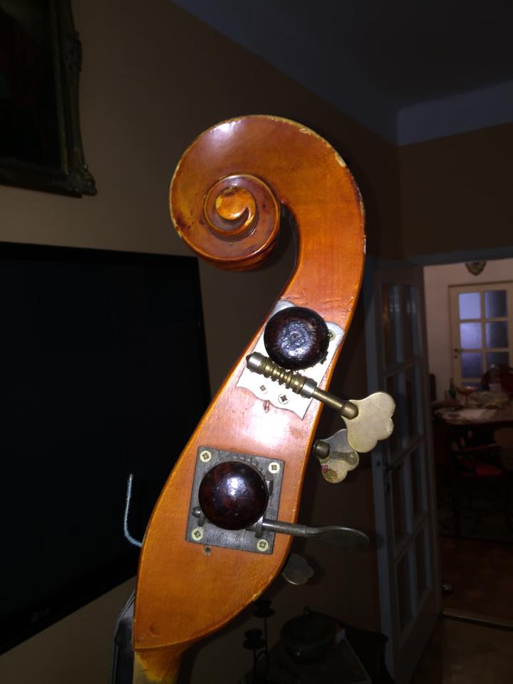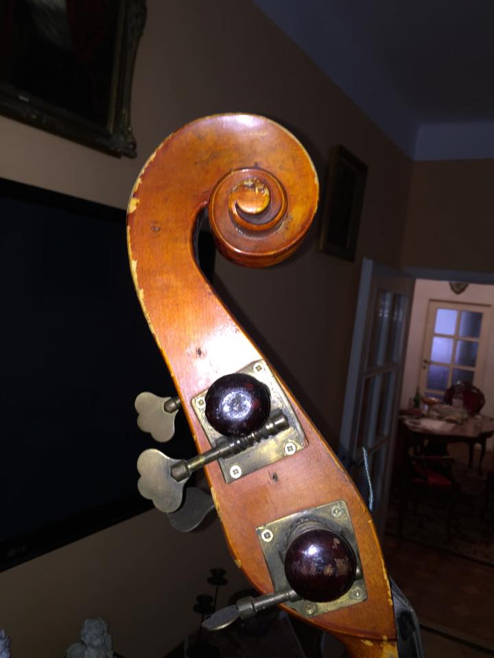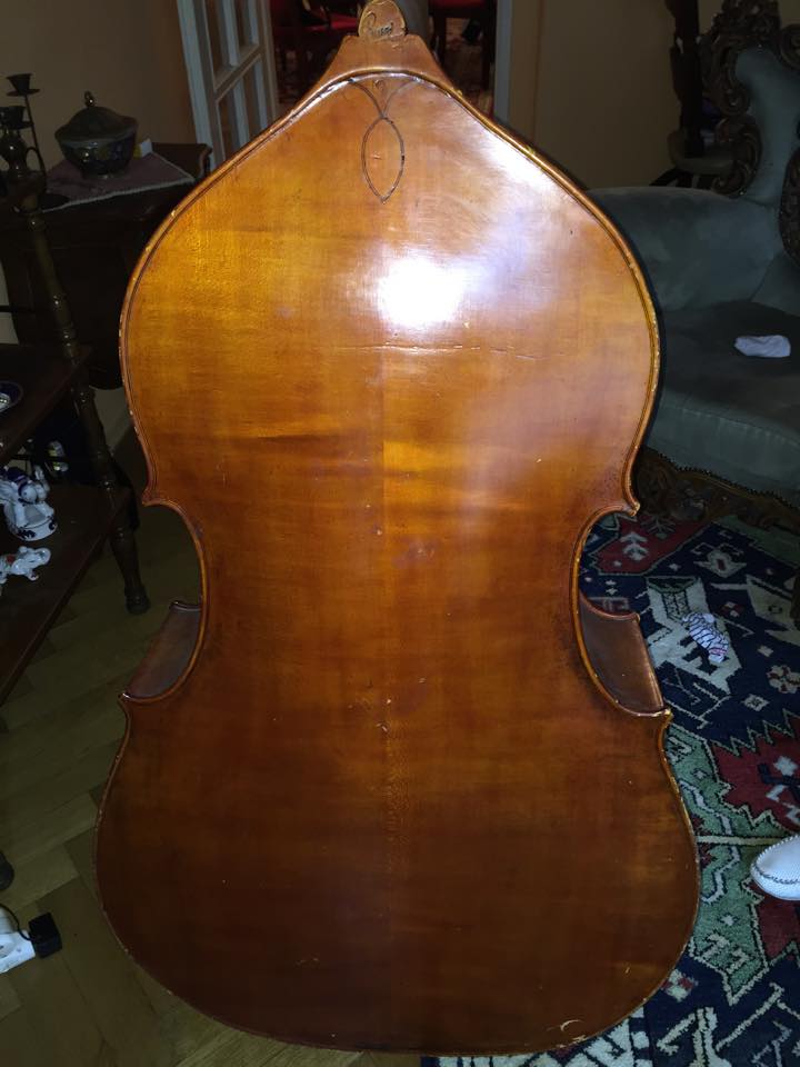 I was offered to buy the following bass. I have not seen it yet, only the pictures. Before I spend the time to travel to see it, I would appreciate to know your opinion about its origin. The name on the stamp (Rysszo?) does not ring any bell. It sounds Hungarian to me, while seller says German, 80 years. The wood on the top plate seems sparse (not dense enough) to me. Many thanks. |