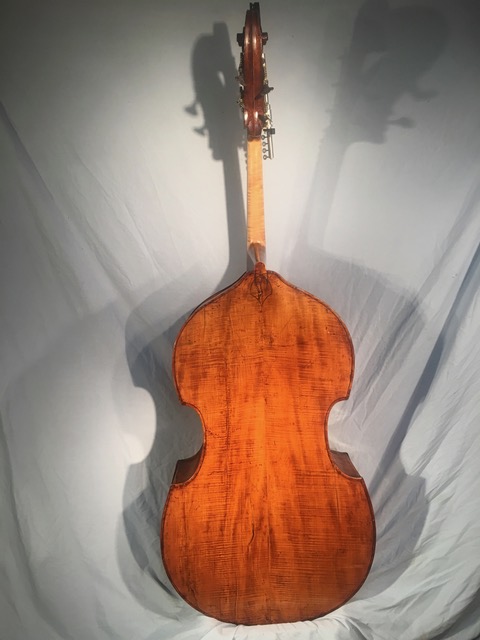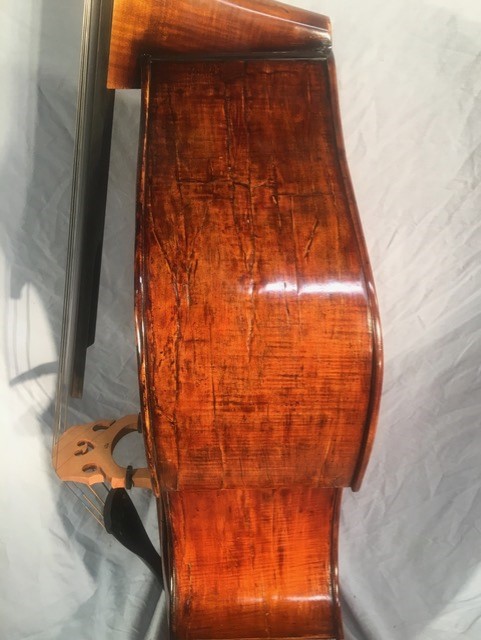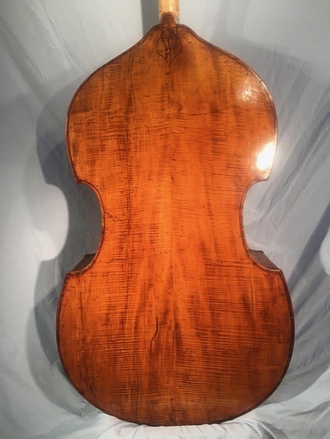 This 'Hand-Made' Bass was originally made without a Neck Block in the Tirol/Bavarian Region that connects Northern Italy, Western Austria and Southern Germany. It was made from very nice wood like the Maple seen on the finer grade Mittenwald basses and inlaid with Violin grade Purfling which combined is a few notches above the infamous 'Blockless Wonders' we have seen and heard about from Germany and Bohemia. The Tone of this Bass is more that of an Old Italian Bass than anything German to my ear. This type of construction has been going on for centuries including the old Guild rule of a fine oil varnish over yellow ground where the original varnish is still intact. It's a shame that the later import models sold in USA have cheapened the image of all basses made in this manner. German makers are known for their robust construction but with this bass I see two things that point to another school of building. First, the original corner blocks which are half the normal size are staying in the bass having been re-fit to keep it original. These corner blocks from top to back are barely 1" in width or depth. The second thing is the unevenness of the entire bass. Look at the bass front and back upper shoulders and the FFs and notice the right side is lower on all three showing the makers hand pulling everything down on that side as if that's how his dominant eye saw it. The scroll is uneven as well and the bass side volute had just been repaired as well from being broken off slightly many many decades ago. Also, the Ribs made with matching wood to the back, are 8 1/4" deep, (9" with top and back plates) and not like the cheaper production models we have seen. This is not a factory produced bass at all but rather a handmade instrument throughout. In the Tirol there were Germans, Austrians and Italians living and working together side by side over the centuries. I have only seen Italians work in this manner so maybe this is made by an Italian trained in the Tirol by the Germans or Austrians or maybe the reverse.