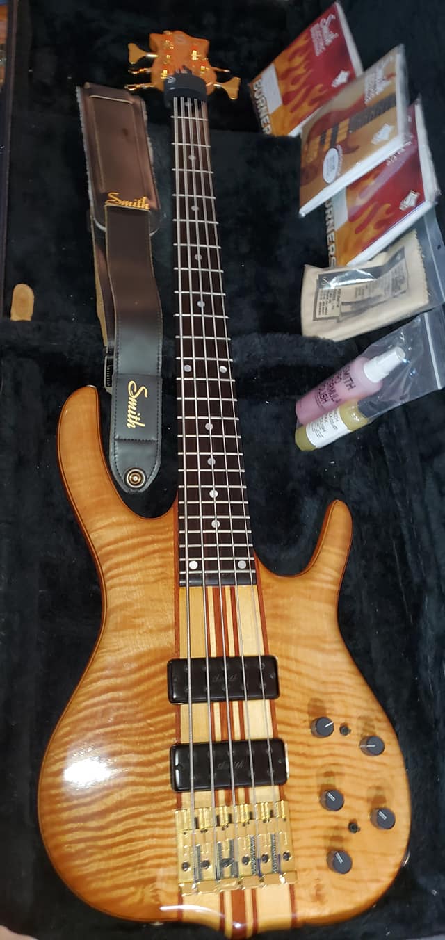 Found a beautiful example of a 1996 Flamed Maple BMT 5 in all original condition. Has the original preamp, pickups, hardware, finish, and case. Love this bass and was blessed to find this 25 year old gem.