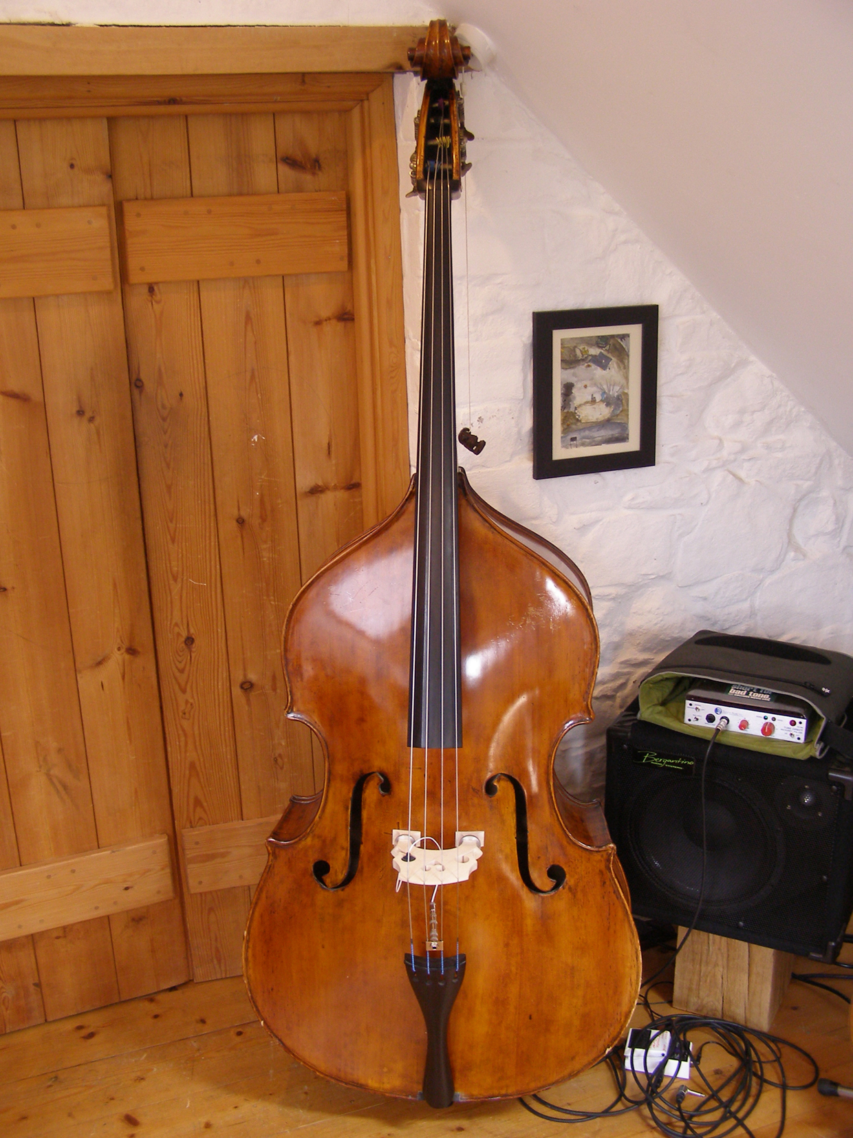 I've just really started playing DB after what seems like an age playing electric. This bass has been in the family for a few years, as my sister needed a better bass for orchestral performances. She has since stopped playing altogether due to time commitments, so in steps the jazz loving brother! I've installed a Fishman Full Circle and a new bridge, to allow a lower action, and it sounds fantastic (and VERY loud). The people at Bridgewood & Neitzert (where we bought the bass) reckon it's German, approx 1920s. That seems like a good estimate to me, but I thought I'd ask here and see if I can find out anything more about it.