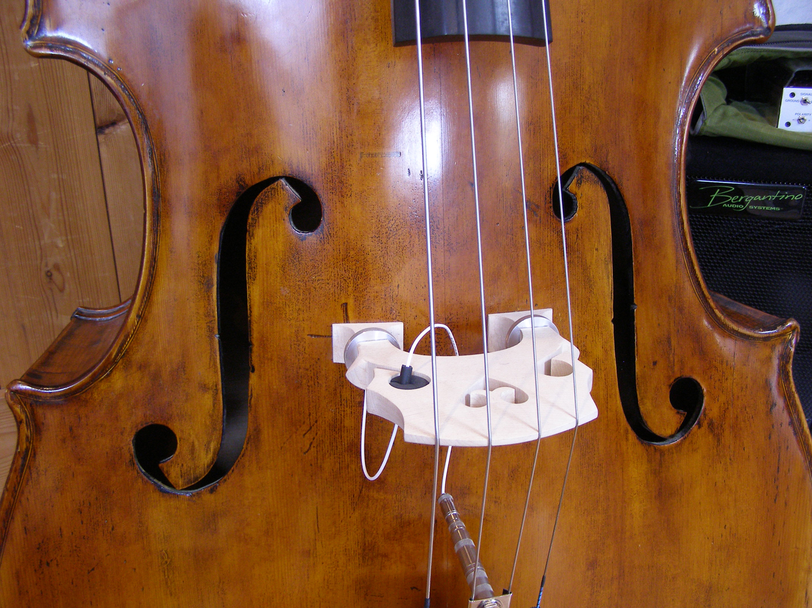 As far as I know the bass had a new bass bar/sound post/bridge when it was at Bridgewood & Neitzert. The back and ribs are a lot darker than the bass bar, but it doesn't look like the inside as aged as much as the outside "appears" to have done. One of the cracks in the ribs is clearly pre-refinish, and the ribs feel like they've "moved" and twisted a little over time. It's so difficult to tell what's going on under the varnish (which seems a trifle thick).