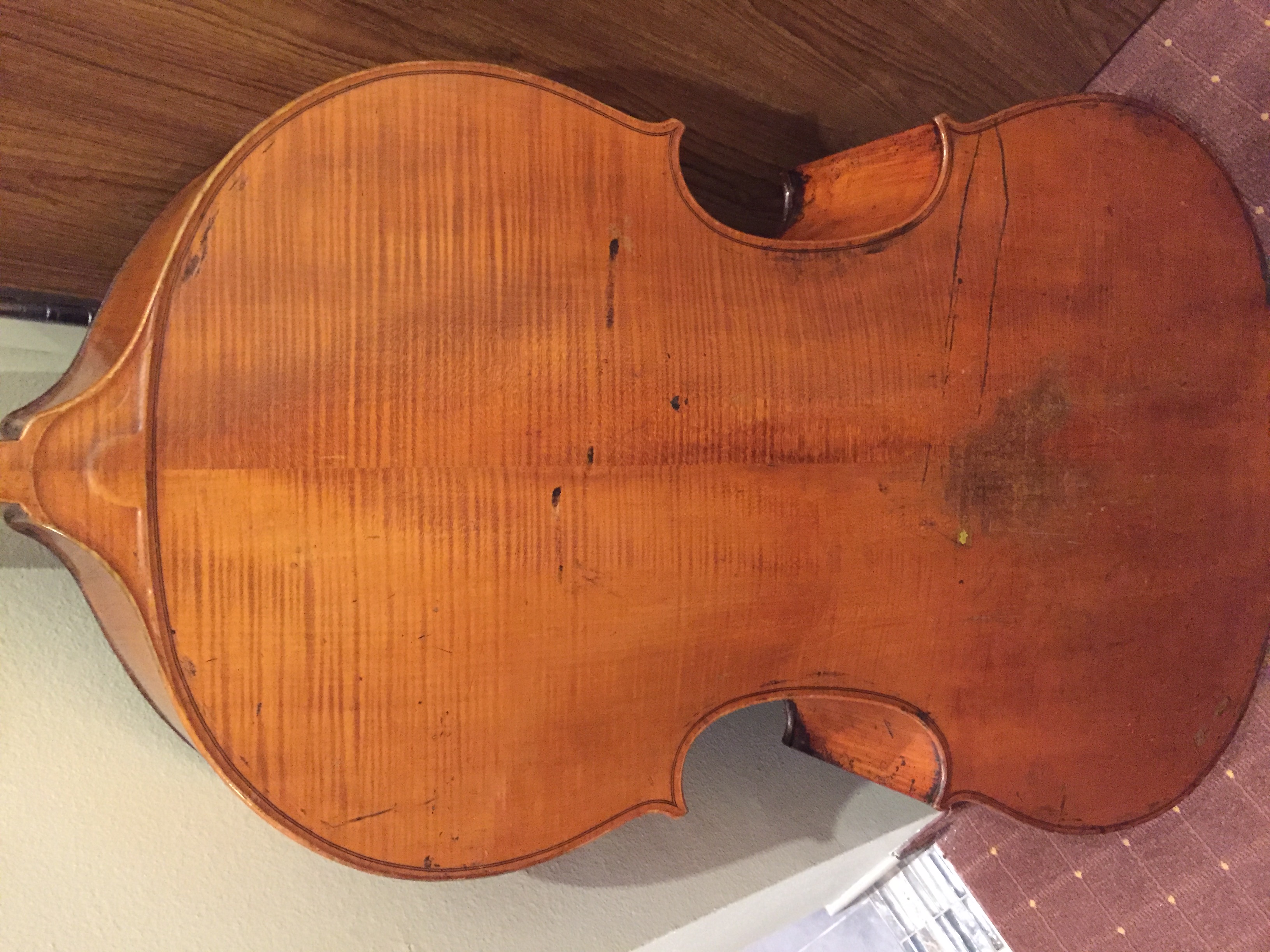 The tuning gears look similar to some Hawkes Panormo copies I've seen. Look at http://steveswanstringbass.com/wp-co...7/IMG_0931.jpg They appear to be originals and the gear type could help put a date on the bass. Looks like someone attacked this bass with their bow tip while playing - scars all around the G side C-bout. I like the looks. If it sounds good, and you like it, buy it. - Dr. C. |