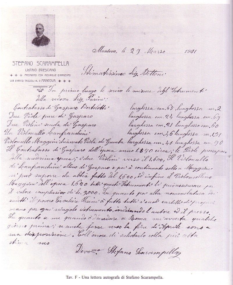 Esteemed Signore Bettoni Firstly, I list the measurements of the instruments belonging to the widow Signore Pasini Double Bass by Gasparo Bertoletti width 65cm length 2m Two violas by Gasparo width 24cm, length 69cm Two violins of the Gasparo school width 21cm, length 60cm One Cello Scanfranchini width 46cm, length 1,31m Cello Maggini called Viola da Gamba width 46cm, length 90cm The Double Bass by Gasparo dates to around 1580 … [he goes on to date the other instruments] … All these instruments are of total insurance value of 9000 Lire. As far as the naming goes, the poor Cavalier Pasini wrote a card in his own hand for every single instrument indicating the maker and the period. When I am next coming to Rome I shall let you know several days beforehand. Toward the end of April I should be able to be at your disposition. It is my honour to salute you with great esteem Stefano Scarampella |
