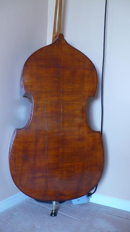 The back does not appear to be original to me. I have not often seen tightly flamed maple like this in a double bass. The color is slightly different than the sides(which also have a nice figure to them).