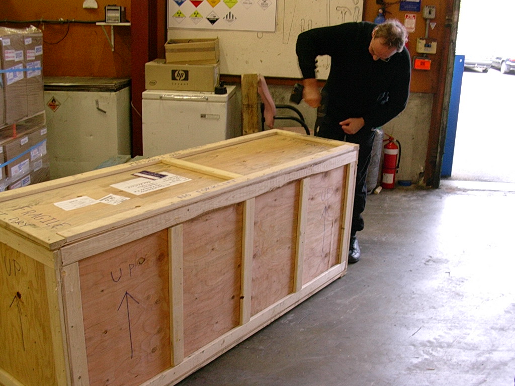 A New Standard Cleveland from Wil and Arnold. I think it's the first in New Zealand, and it's probably the southernmost Cleveland in the world! .Here's the box it came in (that's the freight co. guy): Here it is leaning against my hedge: |