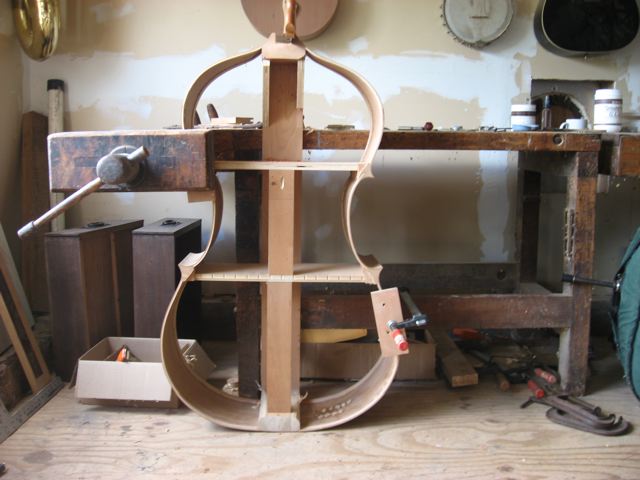 I made a special glue up bench from an old restaurant table. This new bass holder allowed me easy access to the bass carcass during the glue up (saw horses would have been way too cumbersome for this stage). Had to make 44 spool clamps which took up most of the weekend. The back has a 25 degree bend, so it needed special cauls to keep the clamps from slipping. It took about 20 hrs of preparation and staging for a 15 minute glue up. Now it is time to clean up the glue, and start planning the top. |