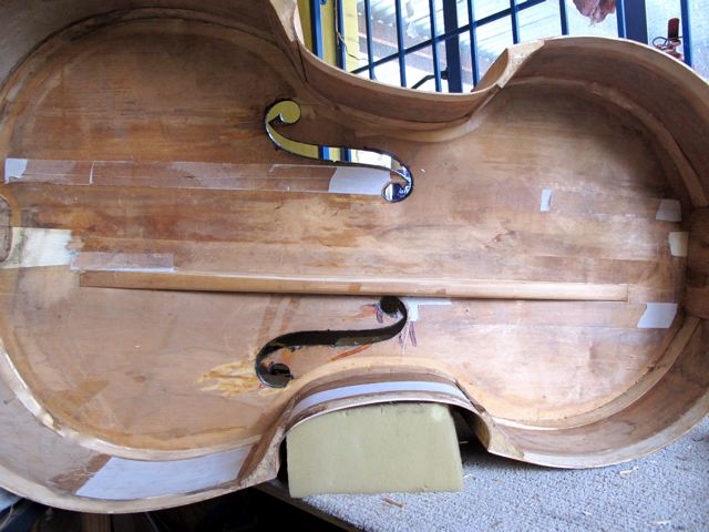 I had this bass ' repaired' by someone a while back who used overly long whole linen strips to hold cracks in the top together.