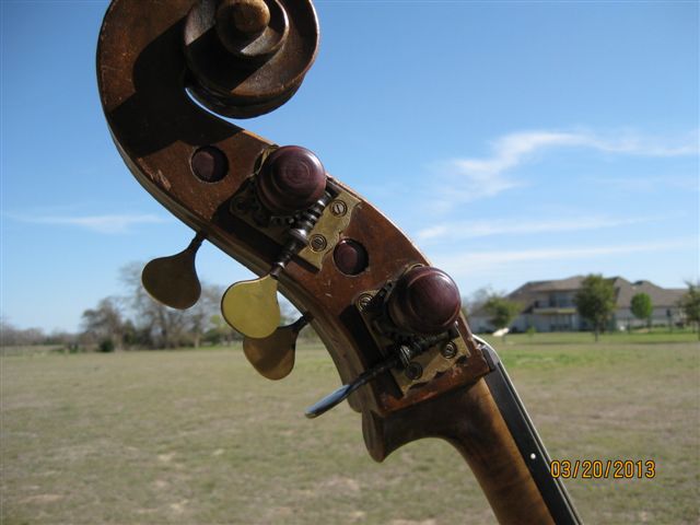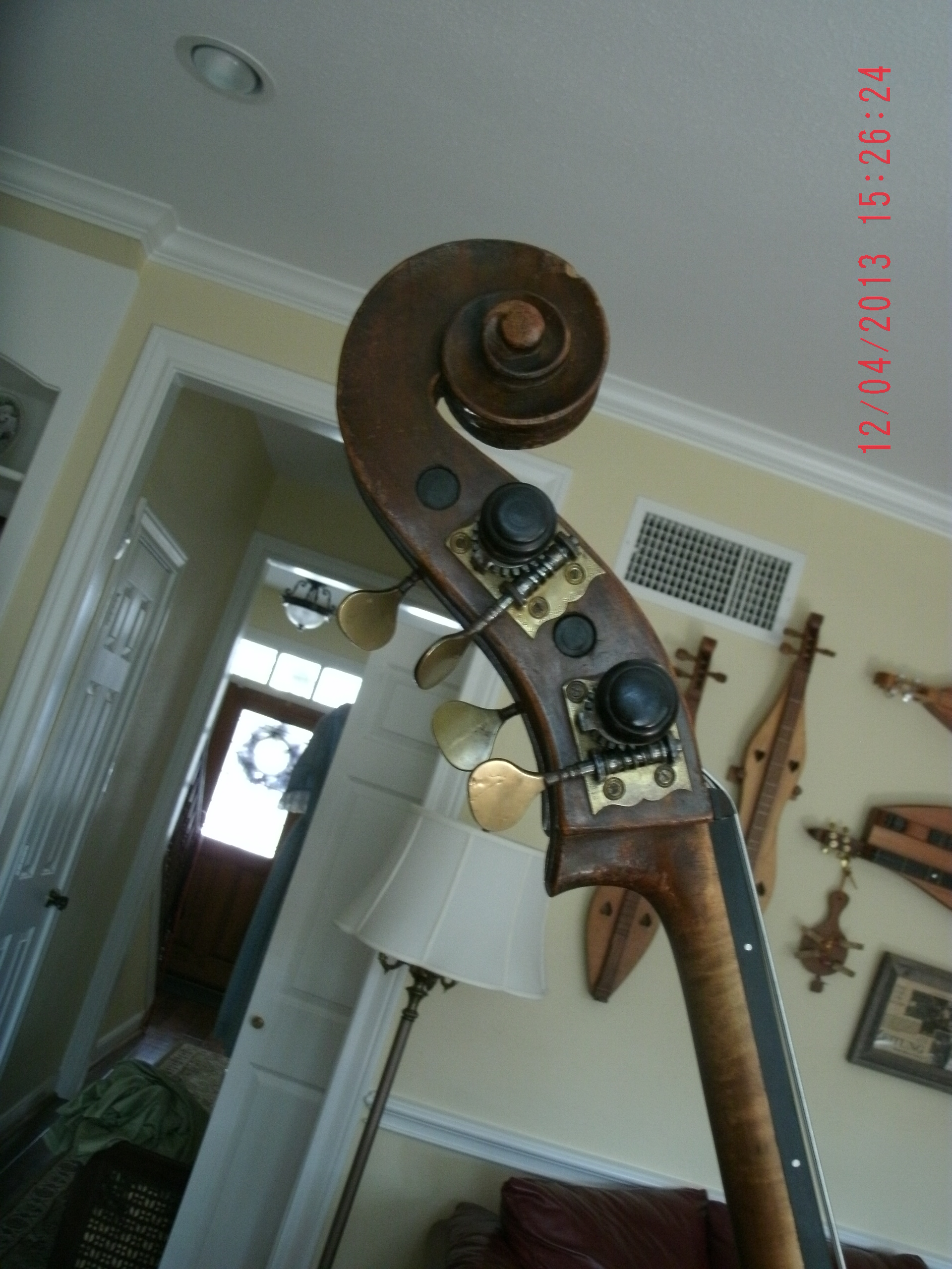 Here are some more pictures of the old bass. I have learned the the previous owner was also a woodworker and turned the hat pegs to replace the ones that were there. At least I'm believing the bass originally had hat peg tuners and the new ones are replacements and not additions.