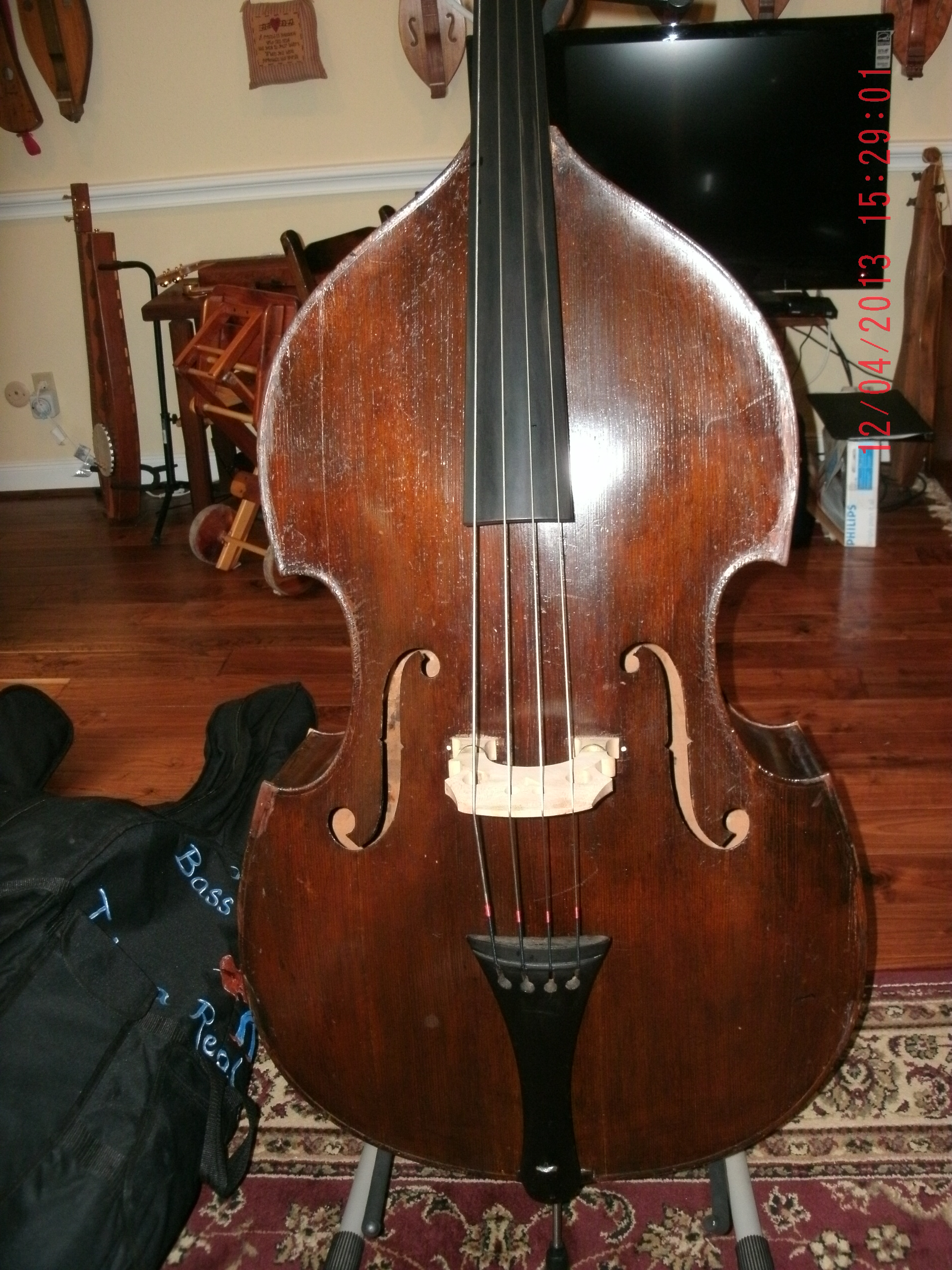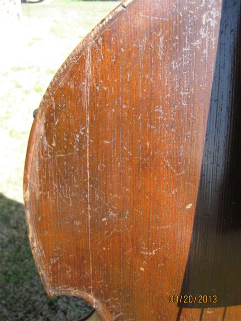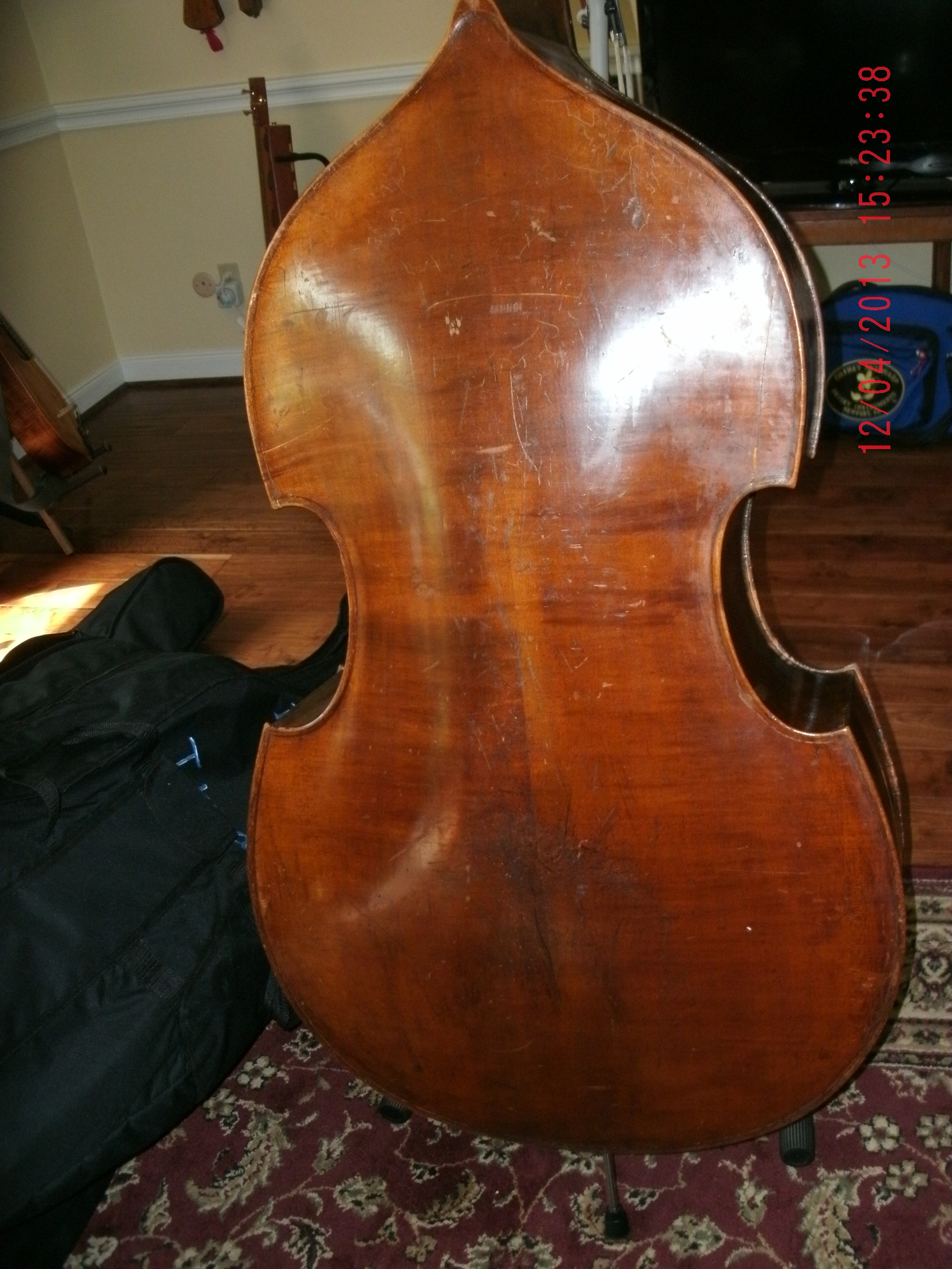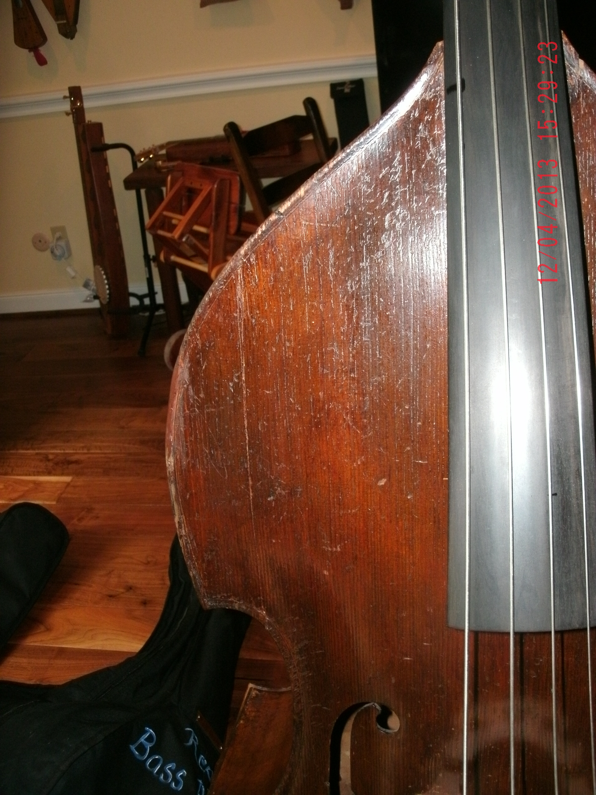 Thank you for your previous assistance. I did buy the bass. It has a very even tone across the strings and up and down the fingerboard. It's easy to play and the price was excellent. I polished it with Orange oil and took some more pictures hoping that would help you in better determining the probable age and place of origin. These pictures show the back and front finish. I notice that there are dings in the wood that seem to have finish in them. The back is particularly that way. Would that indicate the current finish is newer?