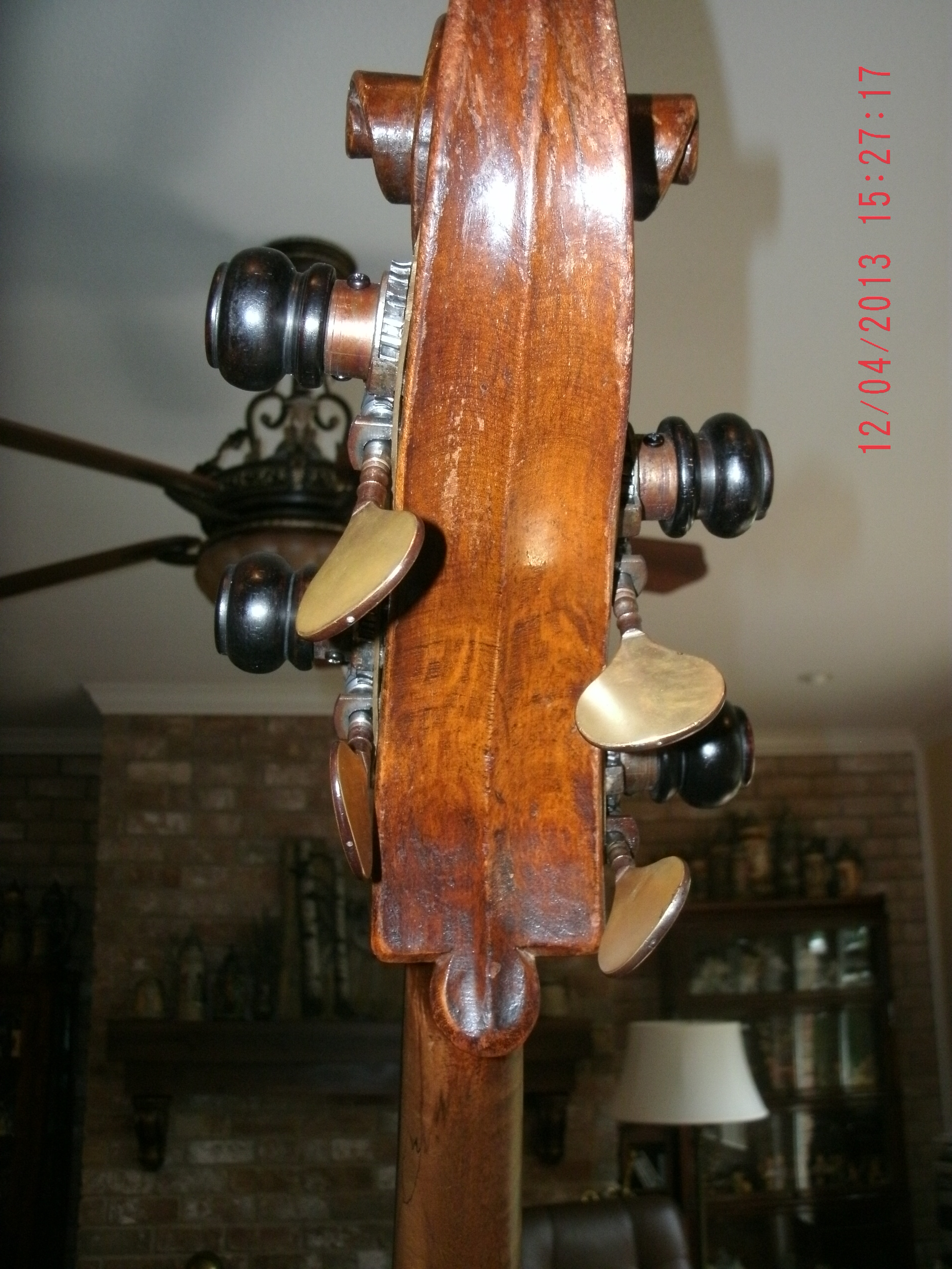 Hi, can you show me all sides of that head/scroll and the rear button. Those purple pegs are not old. The bass looks fairly old and from the German/Czech/Bohemian school. I can see screws in the gears holding the pegs. The gears are old with replaced pegs. Usually they are pinned with a single nail or steel pin, with or without a head but crimped at the end or bent.