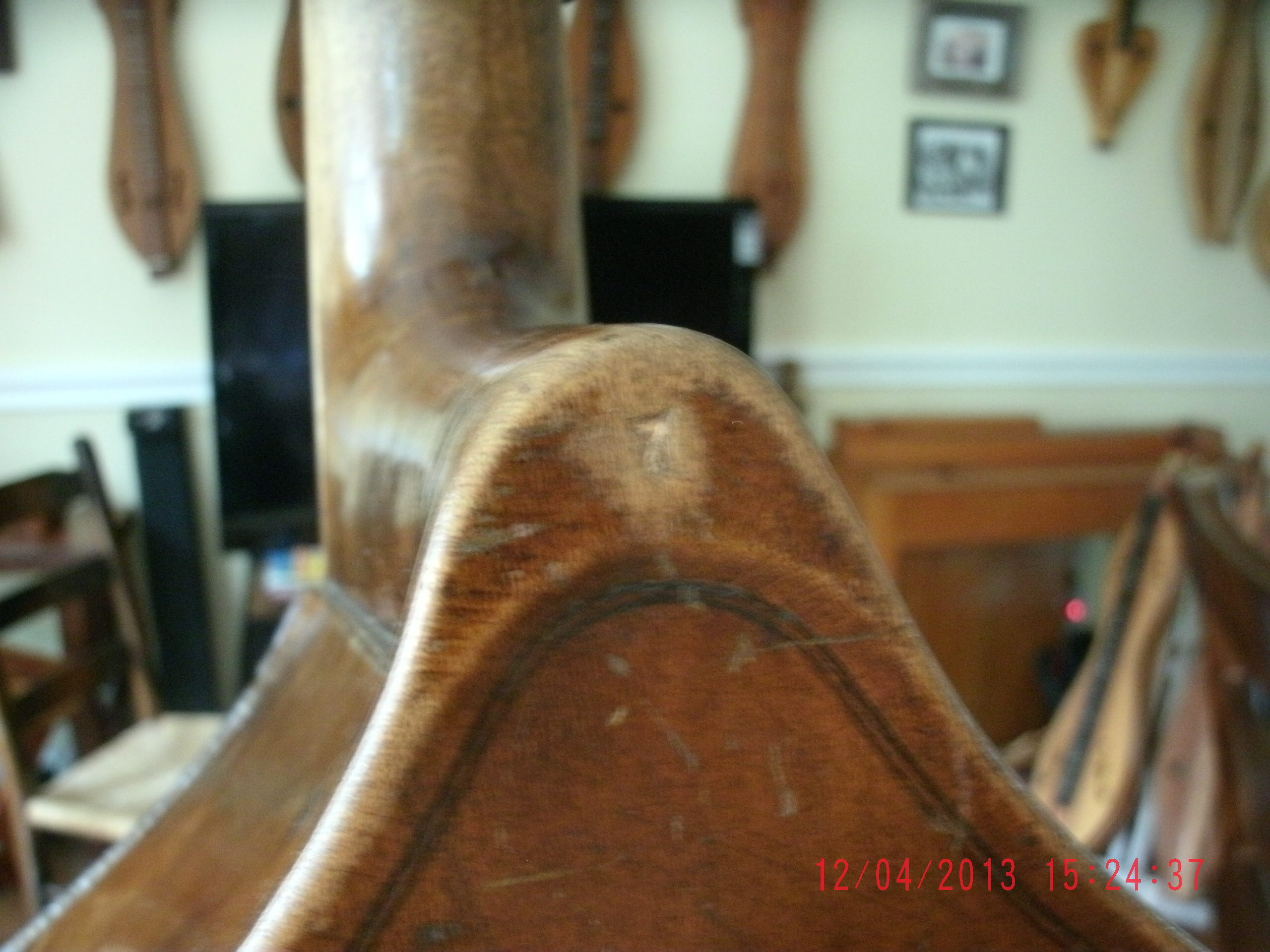 These are pictures of the scroll, the button which has the number 7 in it, and a not so good picture of the inside. I was wondering if the diamond shaped pieces which appear to be there to strengthen the two back pieces are indicative of any place of origin.