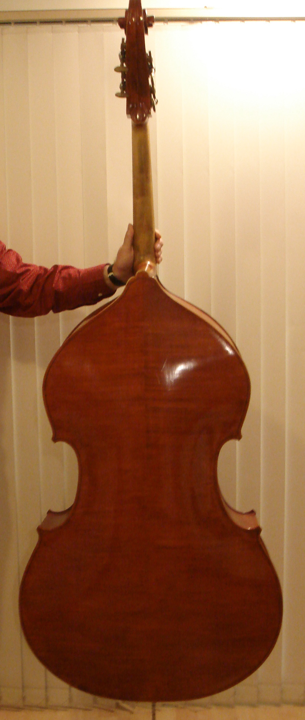I thought you guys may be interested in this maker, Benedict Puglisi from Melbourne Australia who has made several basses, most of which are now scattered around the world in the hands of orchestral or jazz players. This one I have was one of 5 that he finished as a group in 2002. They toured as a section for an orchestra from Stuttgart before being available for sale so they had a little playing in by then. I had the first choice of them and found this one easy to play, very even and nice mellow tone arco or pizz unlike a new bass generally sounds. Also loud enough to play acoustically which is important to me. Interesting enough 3 were of the same design except that the depth of ribs was larger on the other 2 yet this one had easily the bigger sound.