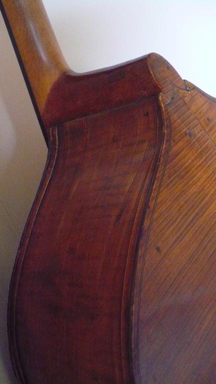 I have recently aquired this German/Tyrolean bass from a friend. The bass is one of the best sounding basses I have yet had my hands on. Notes just seem to jump out of it, with a thickness to them that I haven't experienced from many basses. It also plays like butter, making Spirocores sound dark almost out of the package. I took some time deciding on the bass due to its condition. The price was definitely favorable, but the top has quite a bit of sinkage in the lower bass bar area. It looks like the bar was replaced at some time. However, the top has been stable for the last 7 years that I have known the bass. I made the decision based on the fact that if I put the money into a full restoration later the cost would still be reasonable to me based on how wonderful the bass sounds/responds. I am not sure as to the origin/age of the bass. It does not appear that it was ever blockless, but the shape does resemble many Tyrolean instruments that I have seen. Here are some pictures that I have taken: