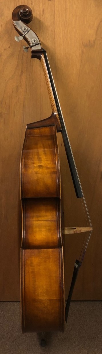 This Bass, although labelled Anton Schroetter is actually a brand made by Hofner and both companies have the exact same address. Other than the label, it's the same exact instrument and model I have seen labeled as Hofner. I had this exact bass in a 4/4 model 5-string just a few years ago made in 1977. This bass was purchased around 1959-1960 by a high-school student in his teens and kept the bass in this immaculate condition for nearly 60 years. I think this bass dates from about the late 1950s and was sold as a new instrument then. I can't recall seeing another bass in this condition that is 60 years old. Everything on this bass, EVERYTHING is original. The strings are the original/original orchestra Flexocors with the wire wrappings around the silk ends in the Pegbox that are from that era as well but the bass may have come originally with Guts. Recently, the bass was set-up including a new adjustable bridge, endpin unit and Fingerboard dressing w/Nut re-cut. Measurements: String Length; 41 1/2" Top/Back Length; 43 1/2" top, 44" back Upper Bout; 19 3/4" Middle Bout; 14 1/4" Lower Bout; 25 1/2" Ribs; 7 1/2" (8" w/T&B), 6 1/2" at Neck (7" w/T&B). Top, spruce with slight figuring/bear-claw. Back and Ribs, lightly figured maple. Neck, beechwood with faux-flame figure, a Hofner signature trait. The 'Hofner signature shaped' Purfling design in the upper back is called 'Blume' (Flower) which was told to me by a person at Hofner I spoke with a few years back when doing research on the 5-String Hofner I had. Other basses from this region used various similar shaped 'Blume' designs but this one IS Hofner's signature pattern. |