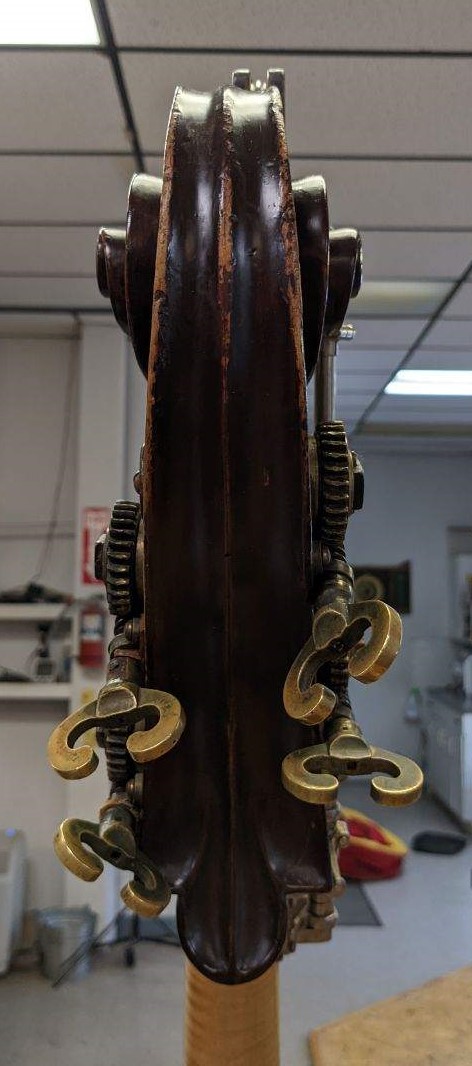 A beautiful old and rare Italian bass. The maker, Pietro Cateni of Livorno (Italy) worked from about 1780-1812. The beautiful old Italian Scroll was made for 3-strings. There are two other known Cateni basses here in USA, one of them was in the Philly Orchestra for 90 years between two different players. The F-holes are similar on all 3 as well as the model but on this Bass the Fs have just a bit more sweep to the upper and lower tabs. The original scroll on the Philly bass was made for 3-strings as well. That bass and this one coincidentally have the same old Italian tuner handles put on in Italy when it they were converted to 4-string, possibly in the same shop. The wide outer strips on the lower Ribs are also on one of the other Cateni basses as well. All three basses I was told were made with the same walnut ribs. All 3 Backs are without the typical upper angle break but are rather steeply bent from just above the upper corner blocks.