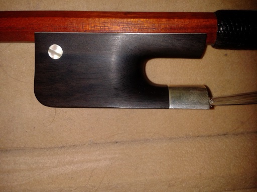 The bow plays beautifully and is very nimble for all techniques. Weight: 134 grams. Length of Stick from Tip (not including Screw): 26 9/16" (27 7/16" with Screw) Playing Length of Hair: 21 1/8" Here are some pics showing his beautiful workmanship |