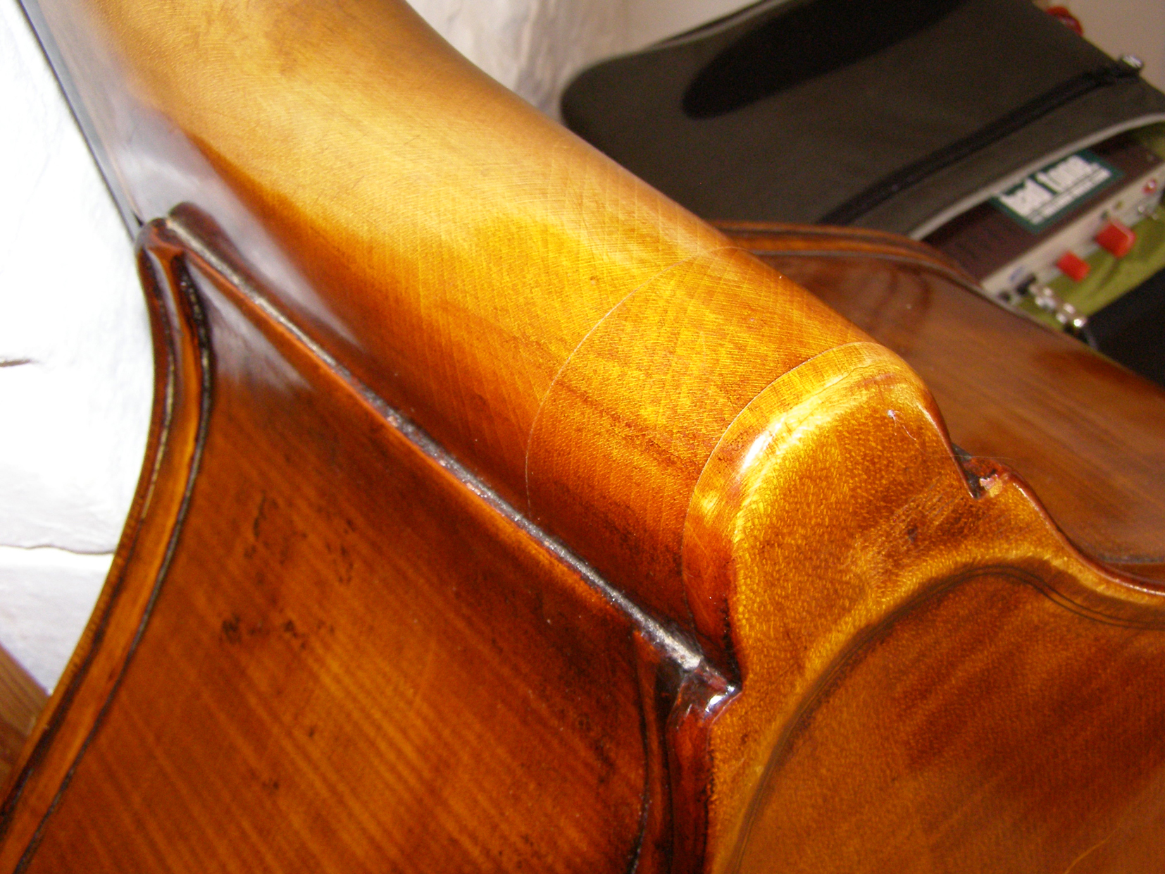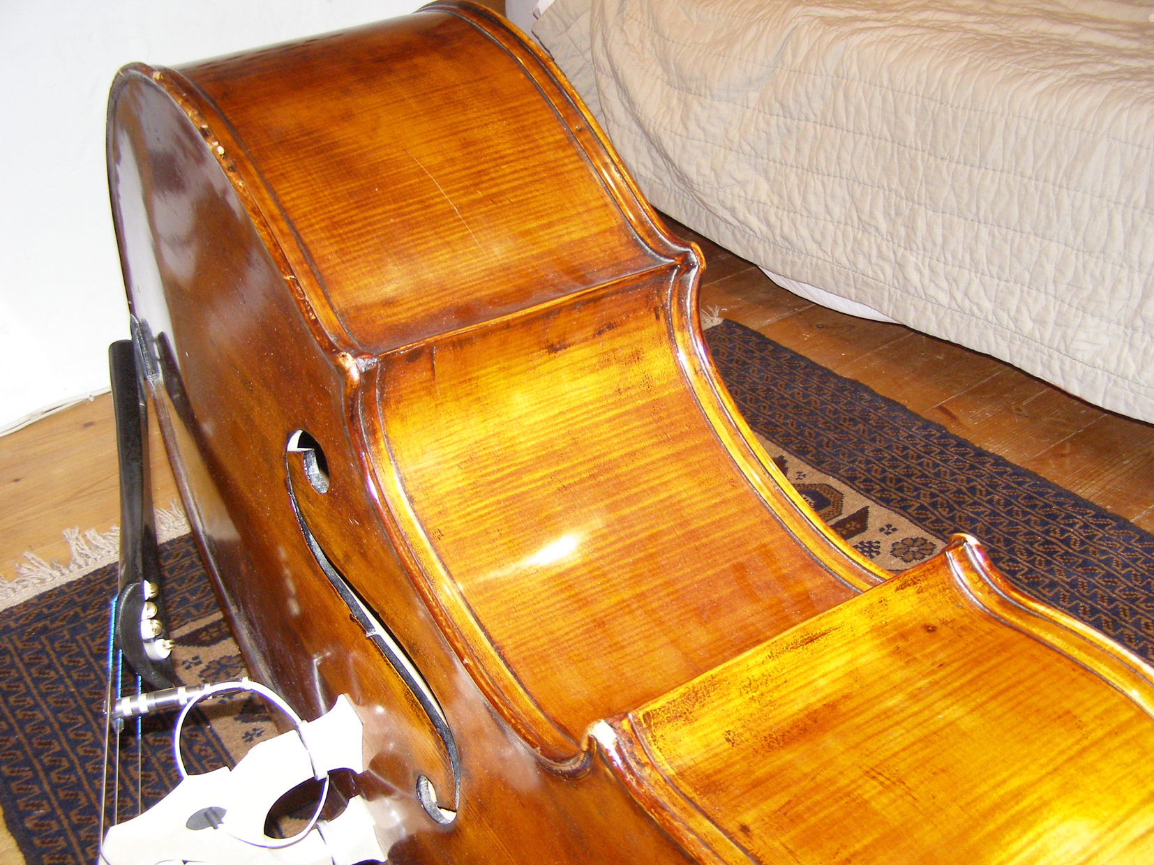 As far as I know the bass had a new bass bar/sound post/bridge when it was at Bridgewood & Neitzert. The back and ribs are a lot darker than the bass bar, but it doesn't look like the inside as aged as much as the outside "appears" to have done. One of the cracks in the ribs is clearly pre-refinish, and the ribs feel like they've "moved" and twisted a little over time. It's so difficult to tell what's going on under the varnish (which seems a trifle thick).
