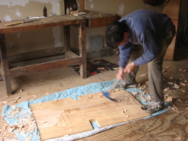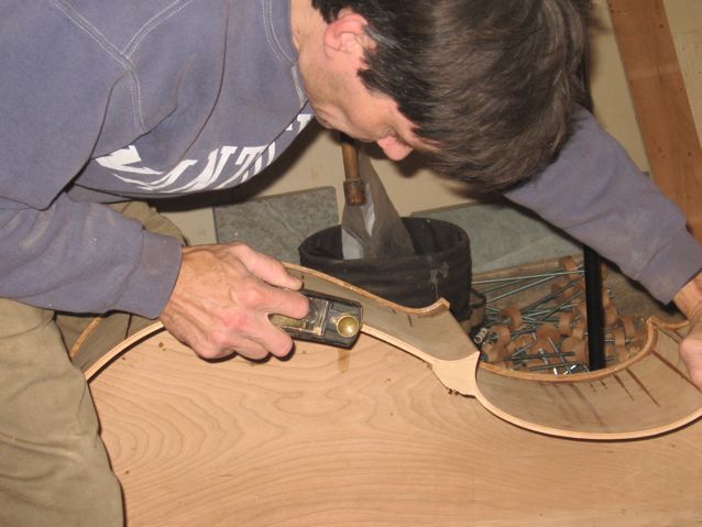 Next up: Leveling the front edges of the rib structure and tracing the bass outline to the spruce top. |