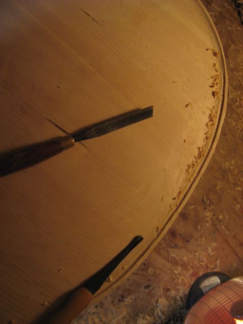 Currently, I am still carving the top by hand; its slow going but a good way to learn. It is tricky navigating the grain direction with all the hills and valleys. The spruce likes to tear out so I try to keep the tools very sharp.