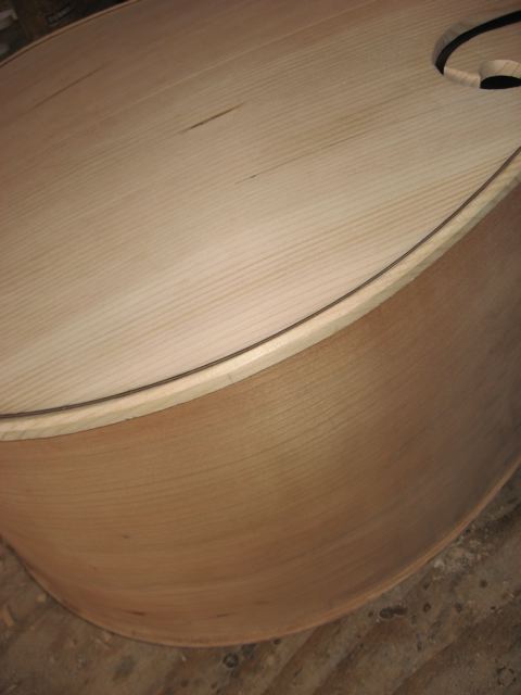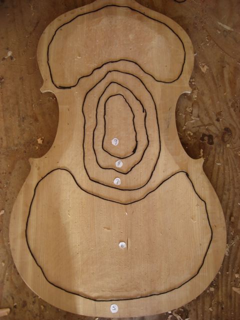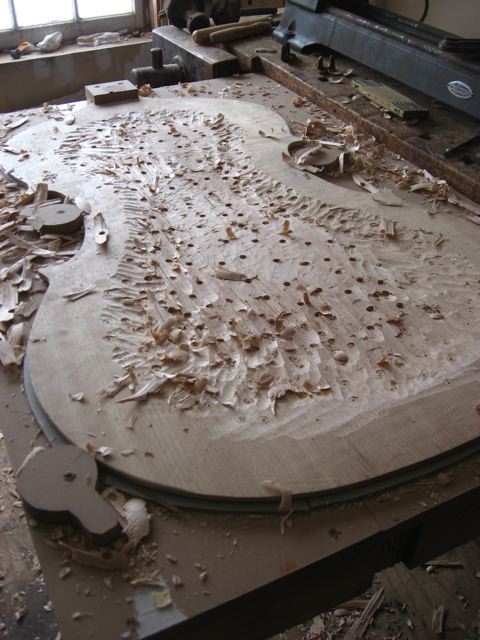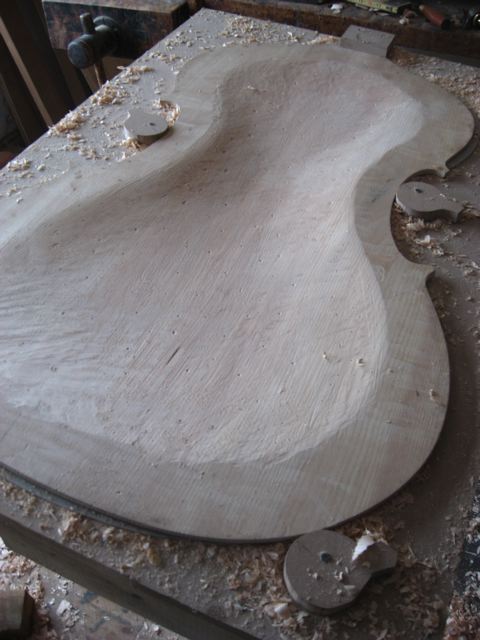 The top now graduates from 10 mm in the center to 5 mm at the edges. It is very flexible in some areas and yet, extremely ridged in other areas. Bass bar is next.