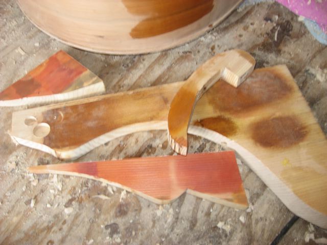 The top is spruce (white wood) while the ribs are cherry (reddish brown color). This could be a problem down the road. I would like to keep the cherry natural (center photo) and match the spruce to the reddish brown of the ribs. I have been doing samples with the cut offs from the top.