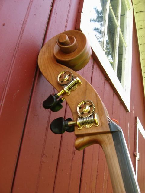Here is the bass with some finnish work done. I tried to match the spruce top, to the natural color of the cherry ribs. Cherry wood darkens with age, so I may refinish the spruce part for a better look, later on.