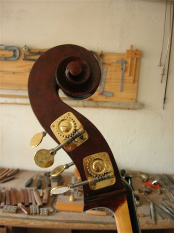 I must apologize for the lack of informations about the varnish and the work I made. So this is the history The instrument has been in my workshop for some years before I decided to work on it. It came from an amateur maker, without bridge, tuning gears, tailpiece, soundpost, back bars. He opened it and begun to repair the ribs with plywood and epoxide resin, and the neck with epoxide resin. Luckily he quit the work and gave me the pieces. I removed the plywood and the resin, made the repair of the ribs, which were heavily demaged with woodworms, changing two sectors of them near the lower block (too many woodworm tunnels) and the upper block, g side ( there was a plywood patch outside). I used walnut wood for them to show the repair. On the back I repaired the cracks and made the bars. On the front I repaired the cracks and the joints and replaced the bass bar. I made the neck graft. There was a thick black coat of something over the varnish. It did not move with turpentine, alcool, trielin, aceton. I cleaned it with waterproof paper, 600 grit, wet with linseed oil. Under it I found what I think is the original varnish, a very poor one, made with a spirit varnish ( shellac? ) and pigments. It was very demaged and incomplete. I made a similar one, shellac and colophon, and found (more or less) the same colour mixing burnt sienna and alizarin carmine. I touched , covered with clear shellac, retouched, recovered, and so on, until the varnish you can see on the instrument now. I think I may say I revarnished the bass, even if I' m not proud of it... |