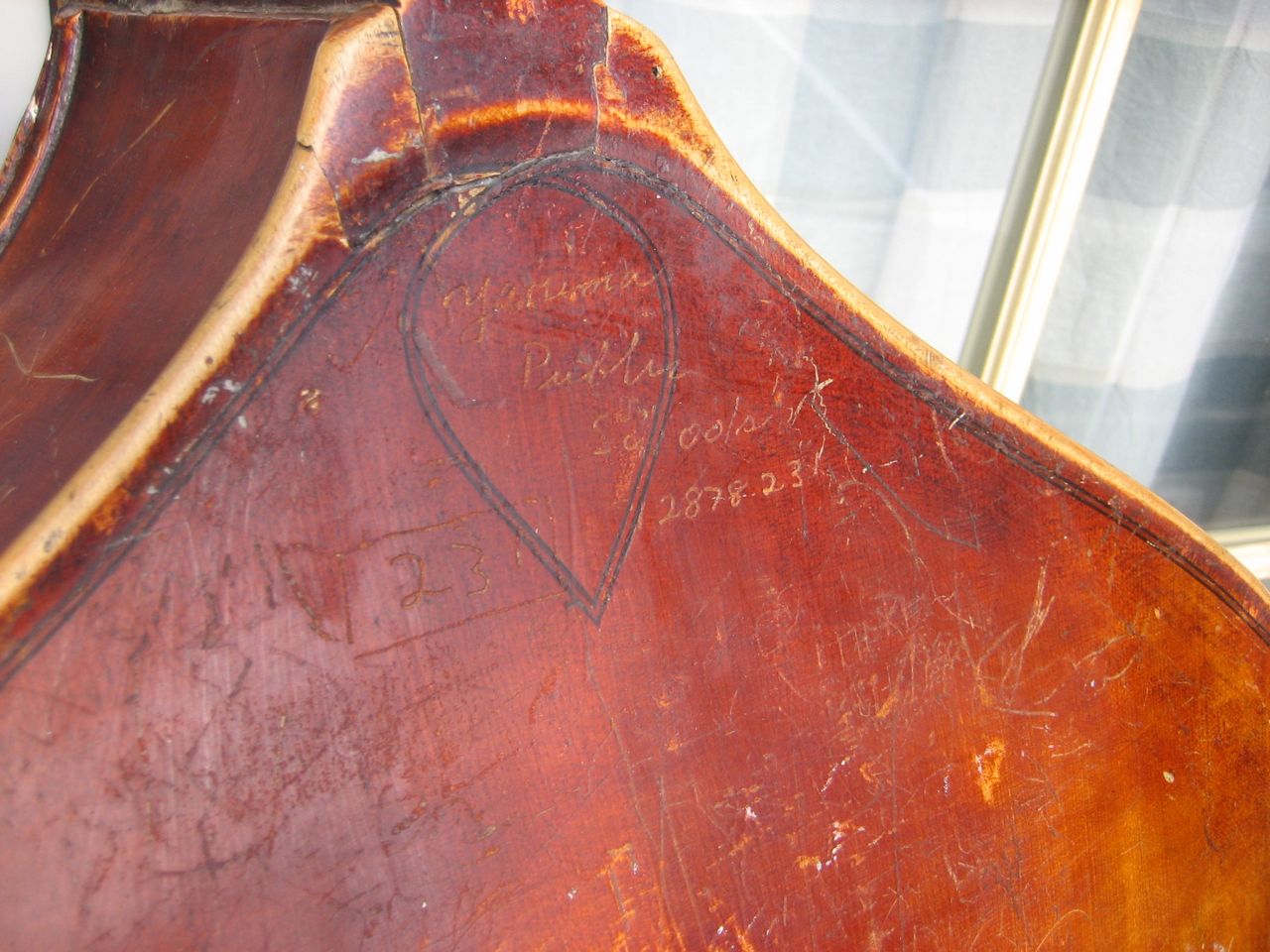 If you look at older posted in the This New Bass section of this forum, you'll see pics of both of my basses. Check out my Pfretschner and tell me that it doesn't look like the younger sister of yours. (There is a single '5' carved into the upper bout on the G string side, which is the only purposeful carving. I'm assuming it was bass #5 in whatever Chicago school it was from.)