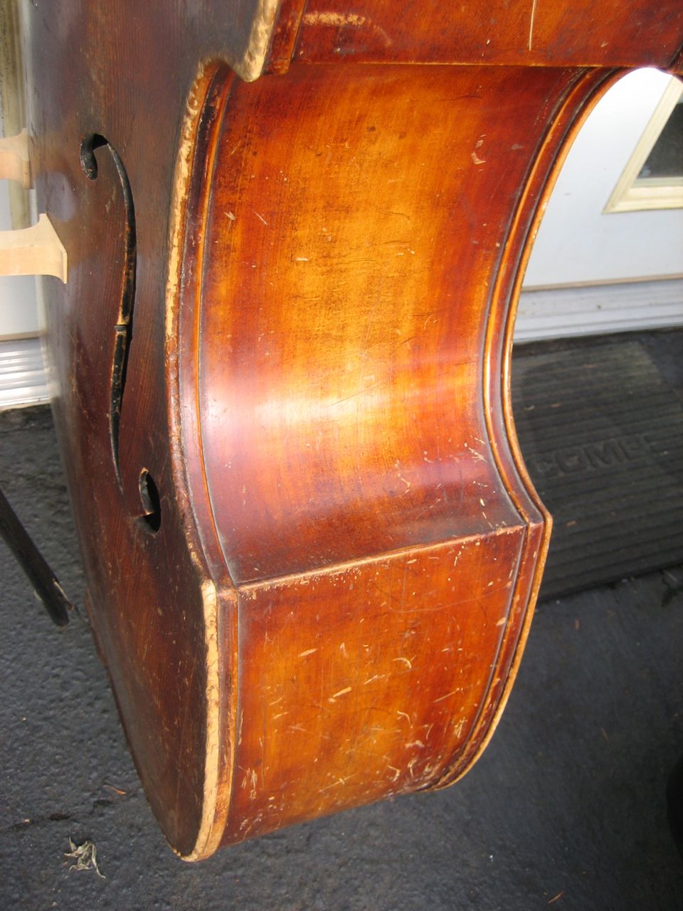 Hi David. I've got a bass very much like yours down here in Portland, although it hasn't seen quite the same treatment and is in fully repaired (although unlikely Ken Smith-Style) condition. It too, I think, is a honey of a bass, although I am kind of wishing I had an excuse to pop the top and have it re-graduated. It is a little thick in the wood, which seems to stiffle it a little. That said, it's a fabulous bass, and was suggested to me by Glen Moore, who said that this bass would teach me many things about tone and basses in general. I feel like it has, and continues to do so.