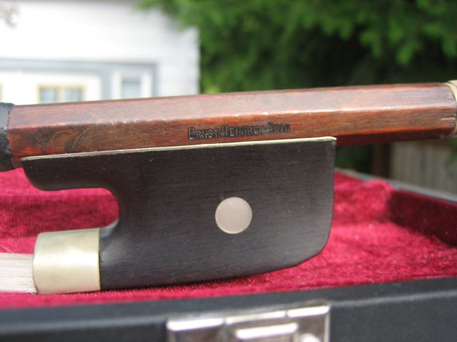I have seen in my hands an old Cello (early-mid 20th century) by Ernst Heinrich Roth but it was the real deal. A nicely handmade Cello. This Bow looks more like a factory job with a famous name stamped in it. Take it to a nearby Violin shop and see if you have any luck with the age and origin at least. If not, send it somewhere if you suspect it may be genuine. This name as well as several others appear in many newly made instruments and bows having nothing to do with these families or even the era in which they lived.